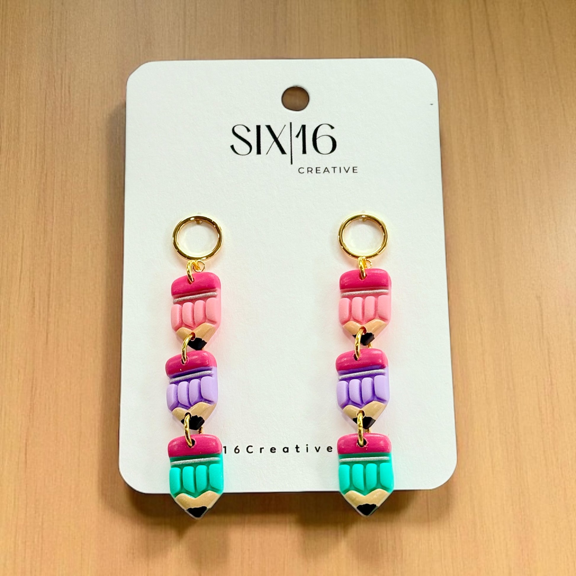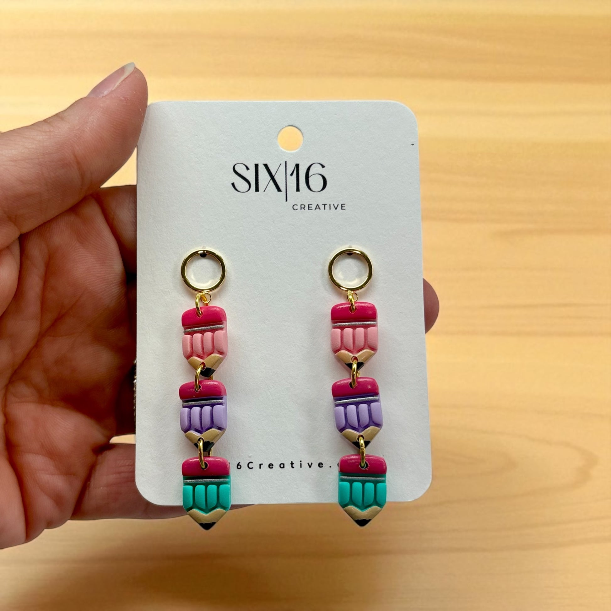 Stacked pastel pencil polymer clay earrings on a gold circle with a stainless steel post. Earring length is approximately 2 inches.
