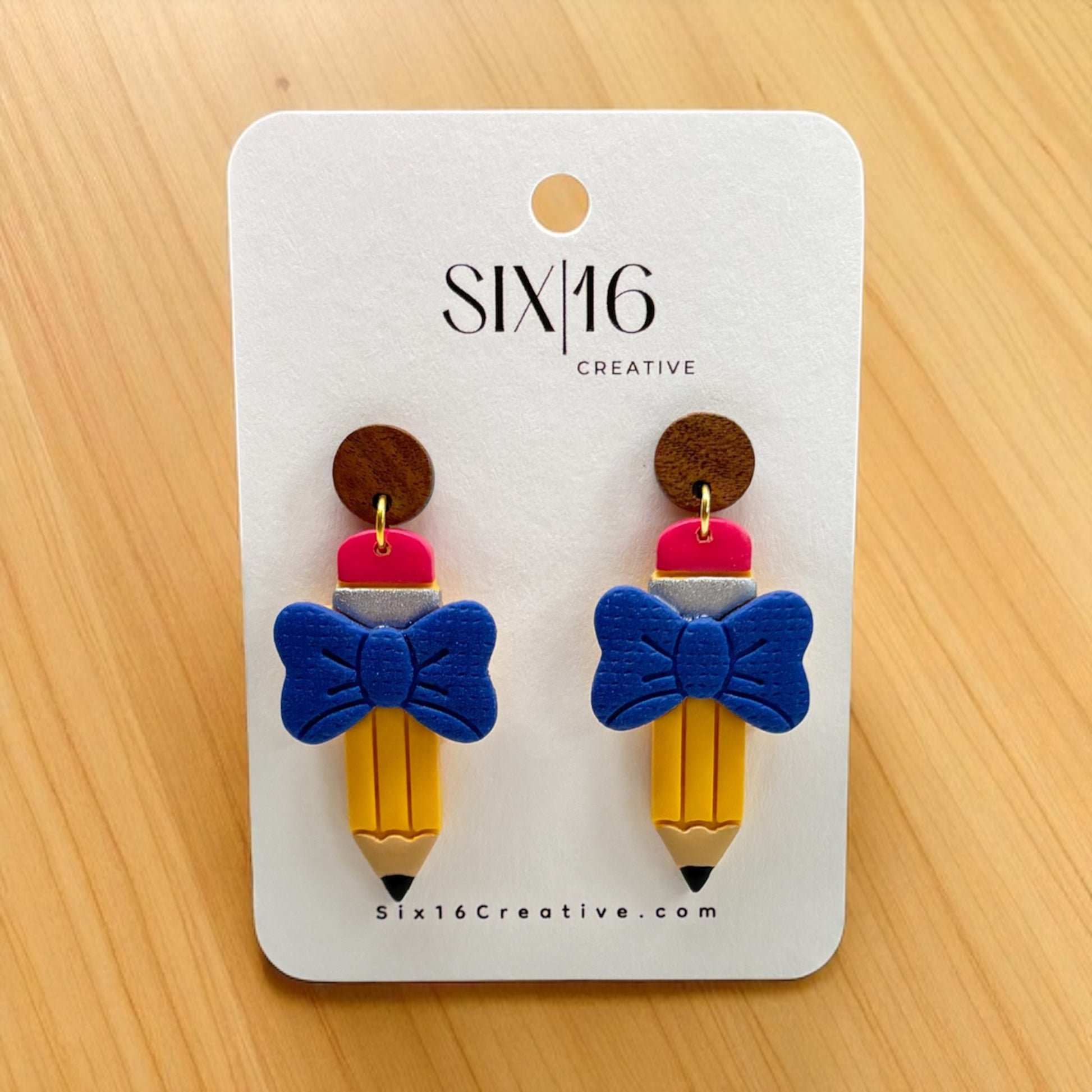 Pencil and blue bow polymer clay earrings on a wooden circle with a stainless steel post. Earring length is approximately 2 inches.