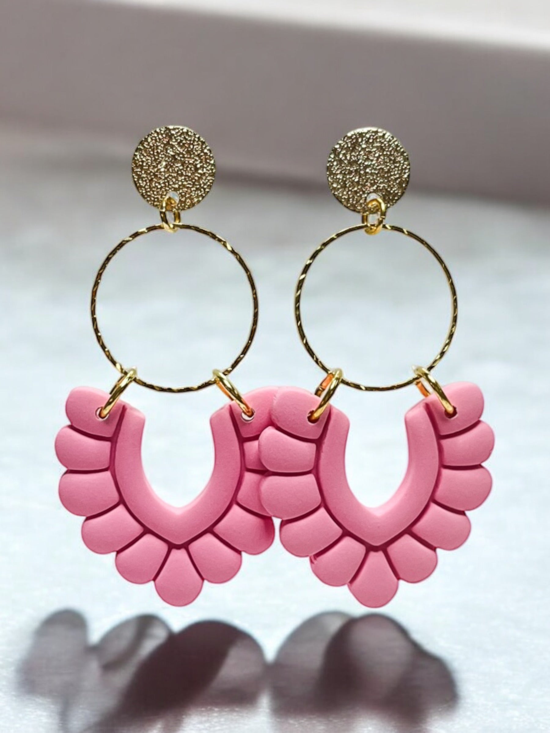 Pink polymer clay earrings on a stainless steel gold circle post. The length is approximately 2 inches.