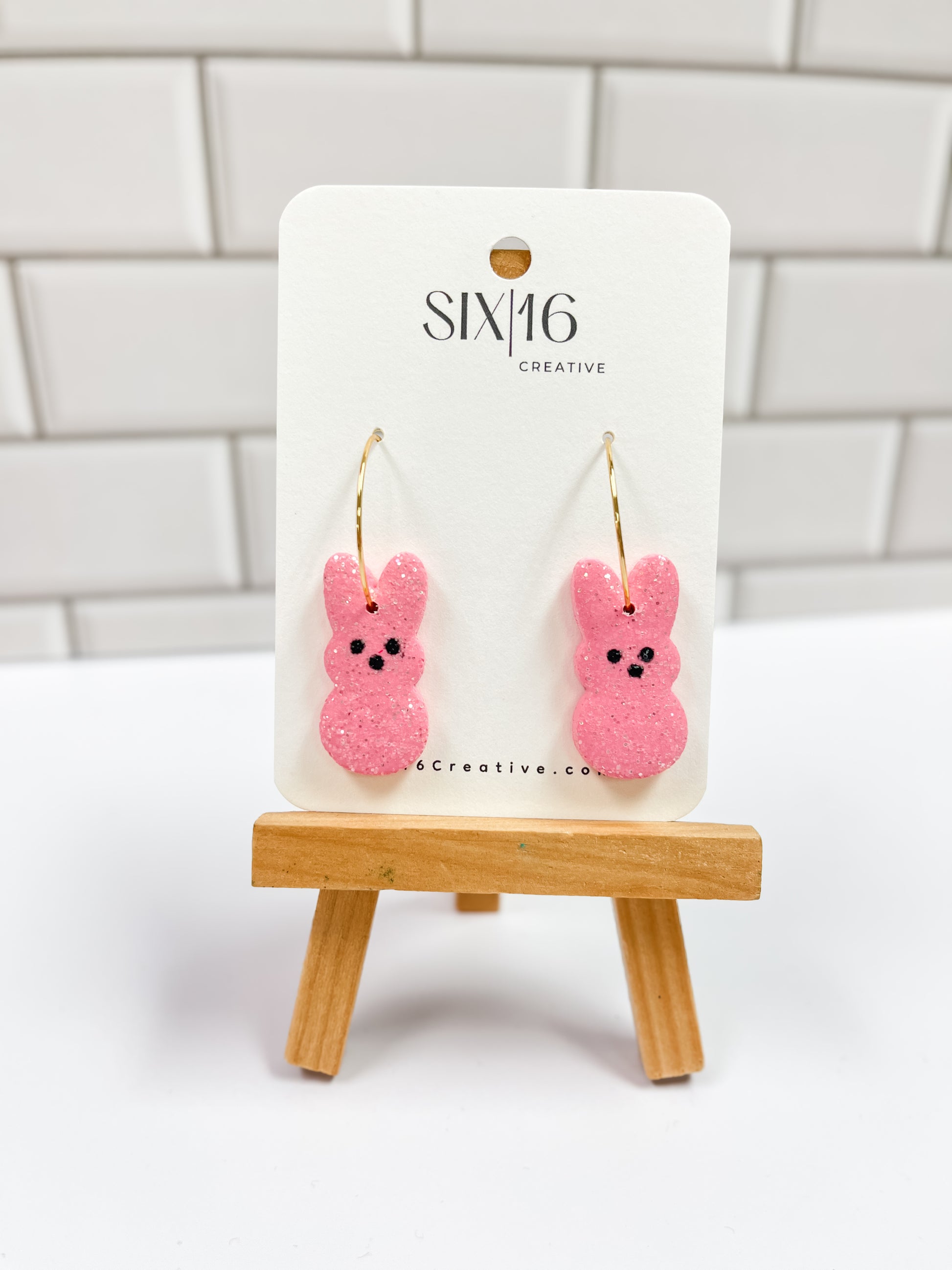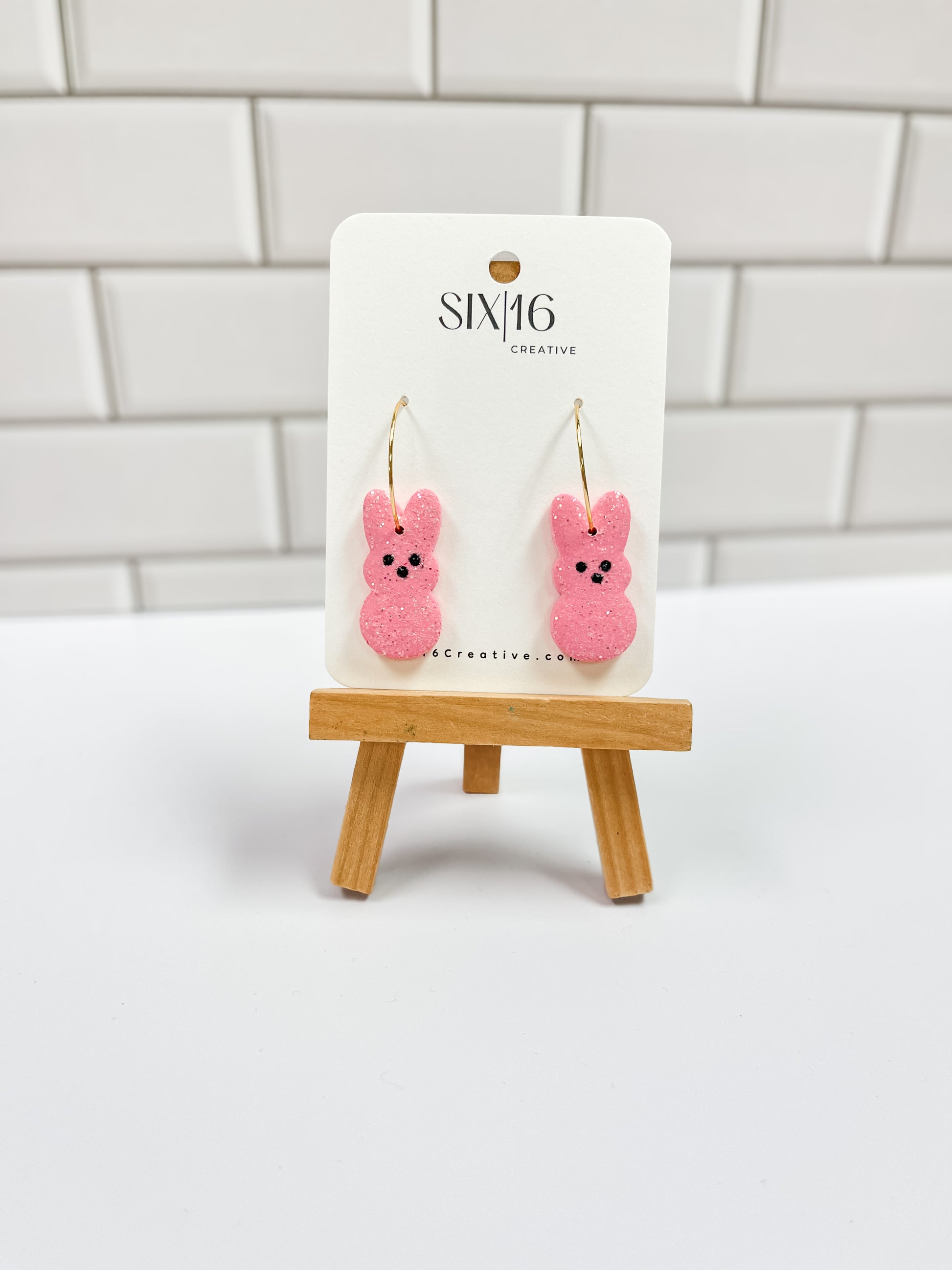 Pink marshmallow bunny earrings on a stainless steel gold hoop. Earring length is approximately 2 inches.