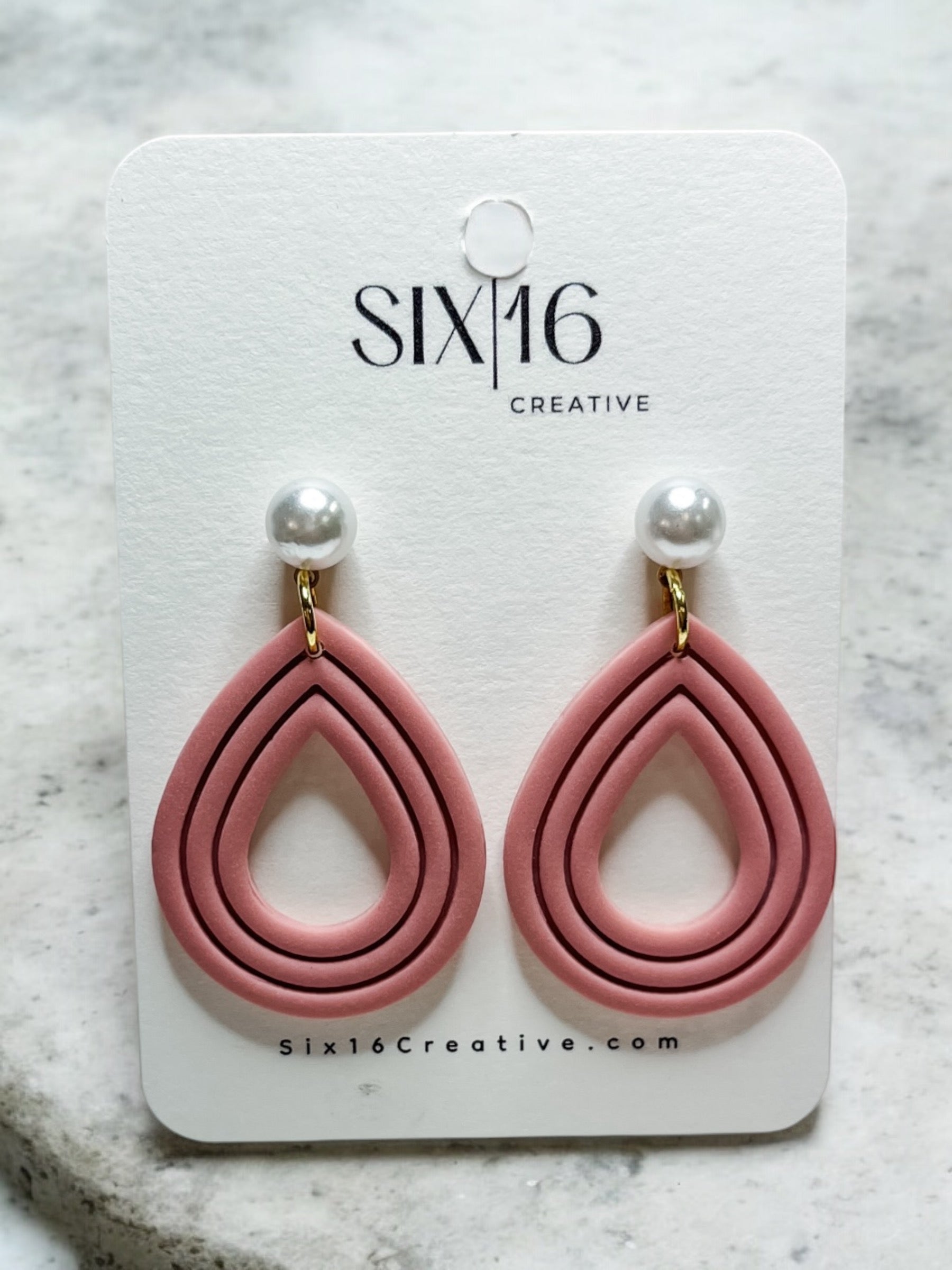 Light pink teardrop polymer clay earrings on a pearl and gold circle post. Earring length is approximately 1.75 inches.