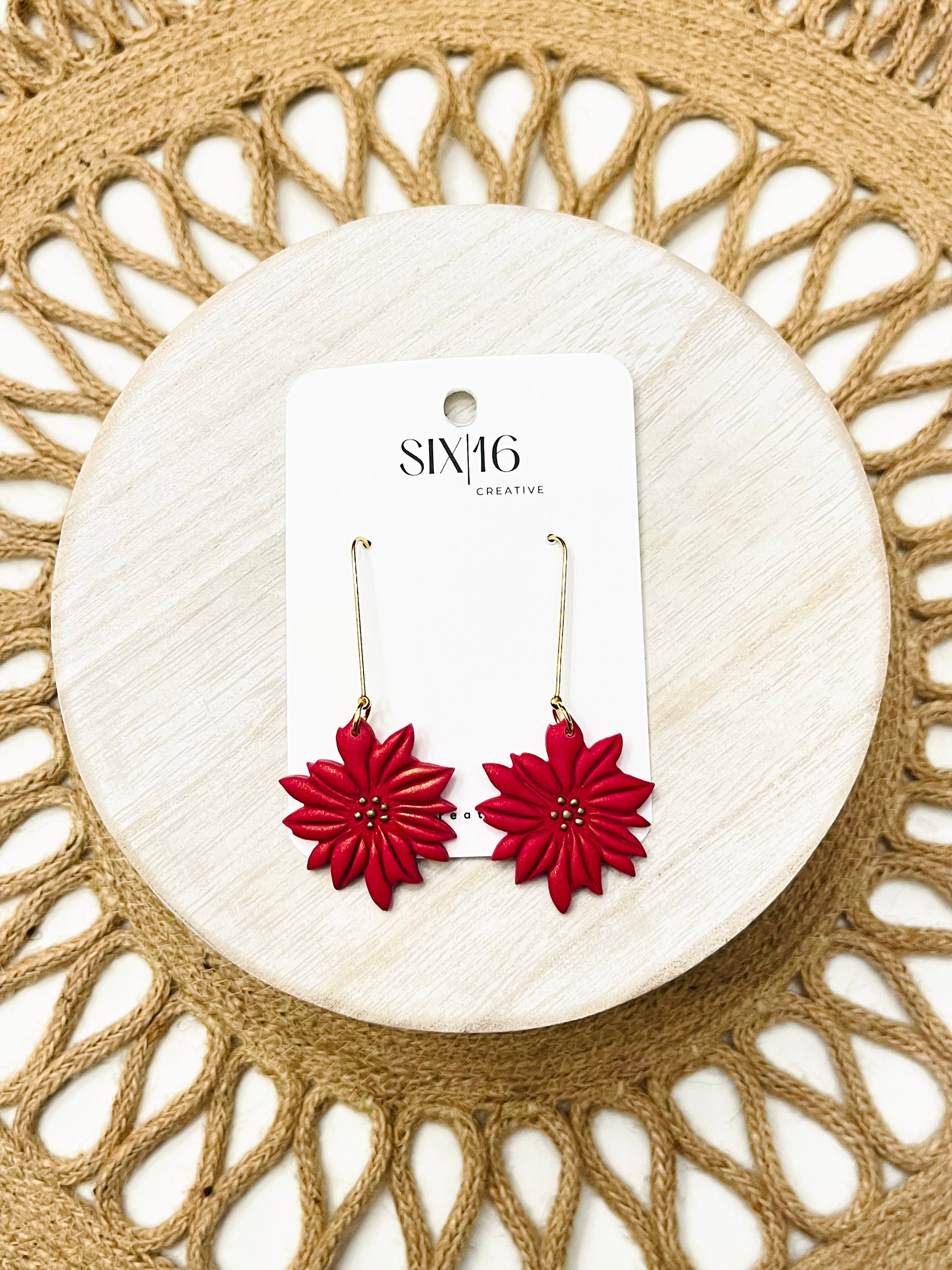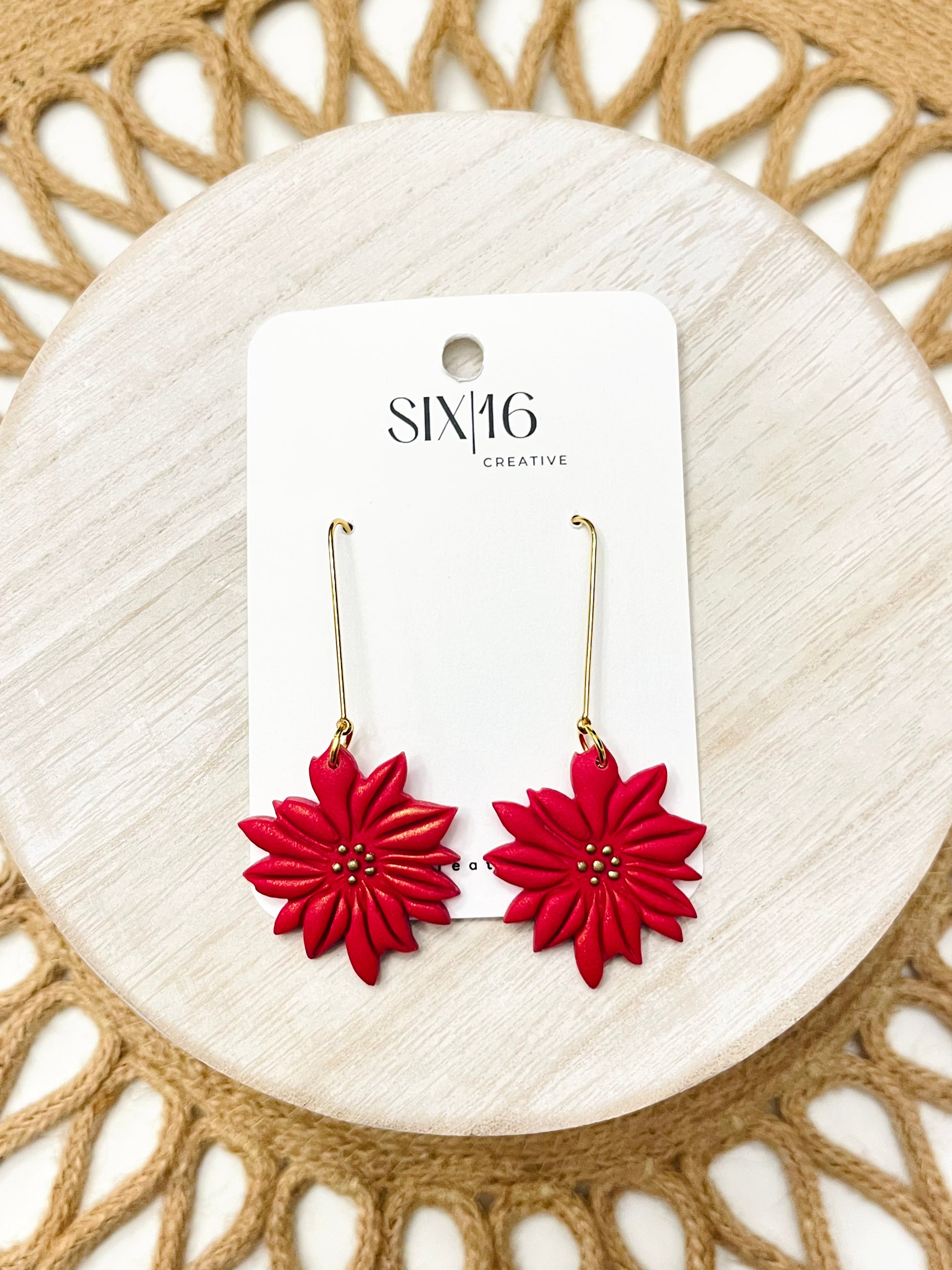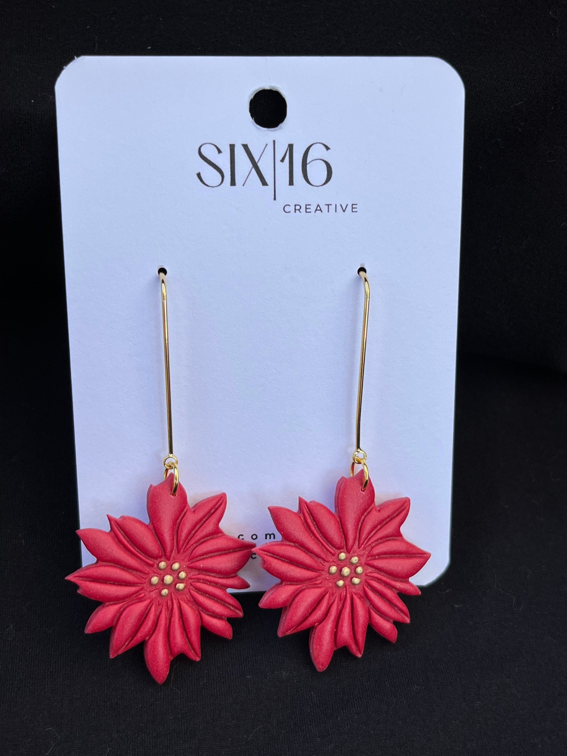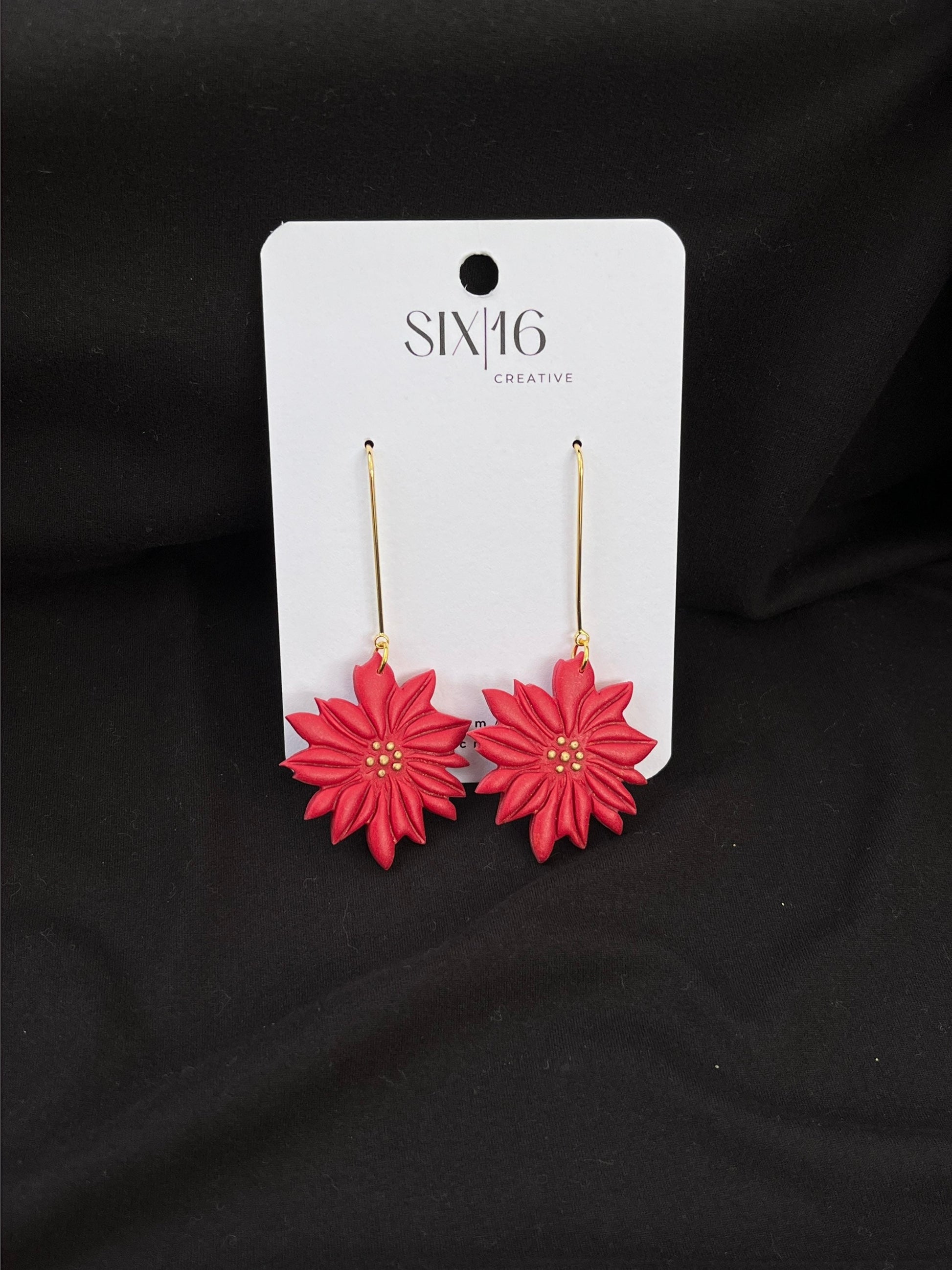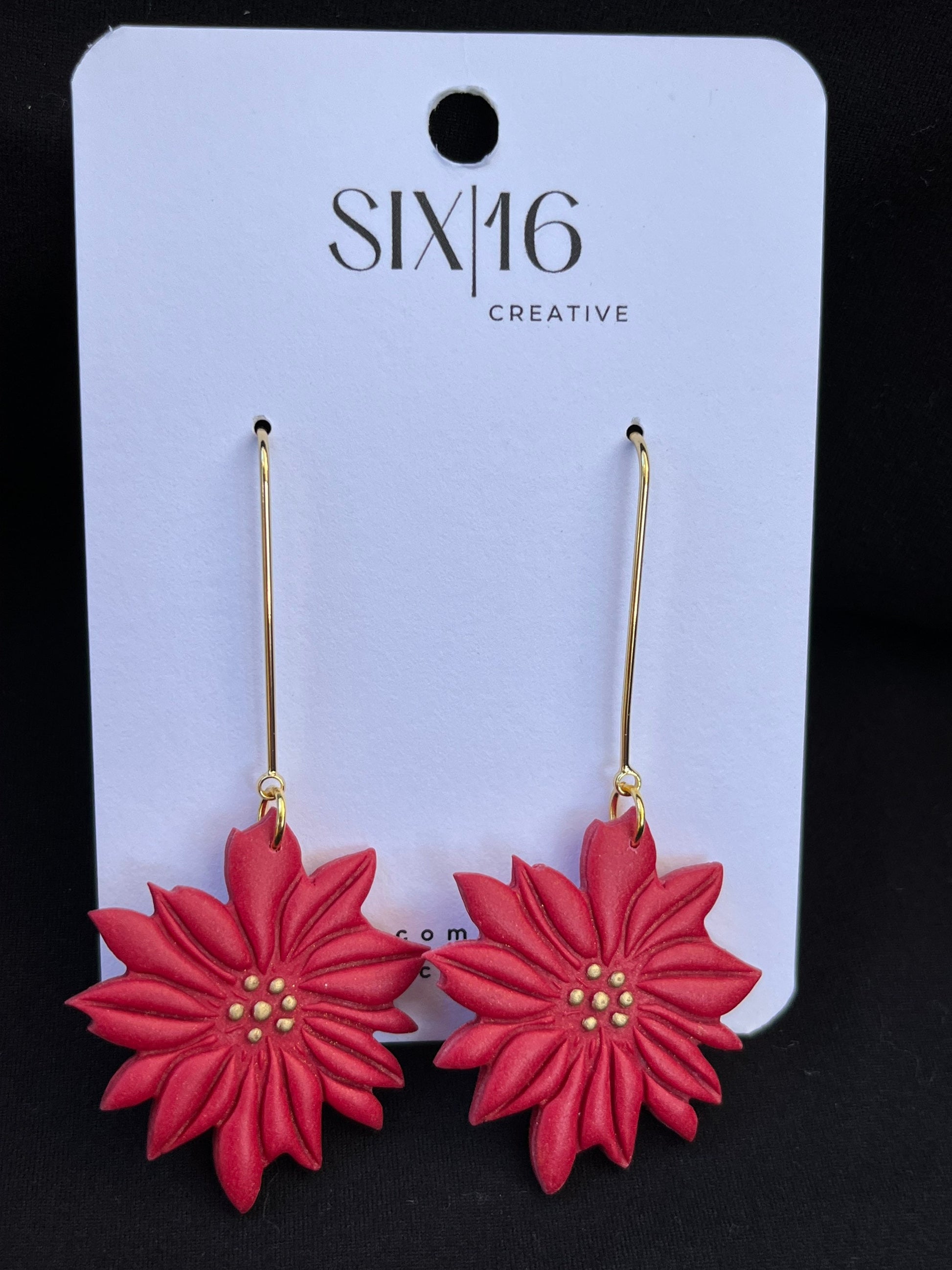 Poinsettia polymer clay earrings on a stainless steel long gold hook. Earring length is approximately 2.5 inches.
