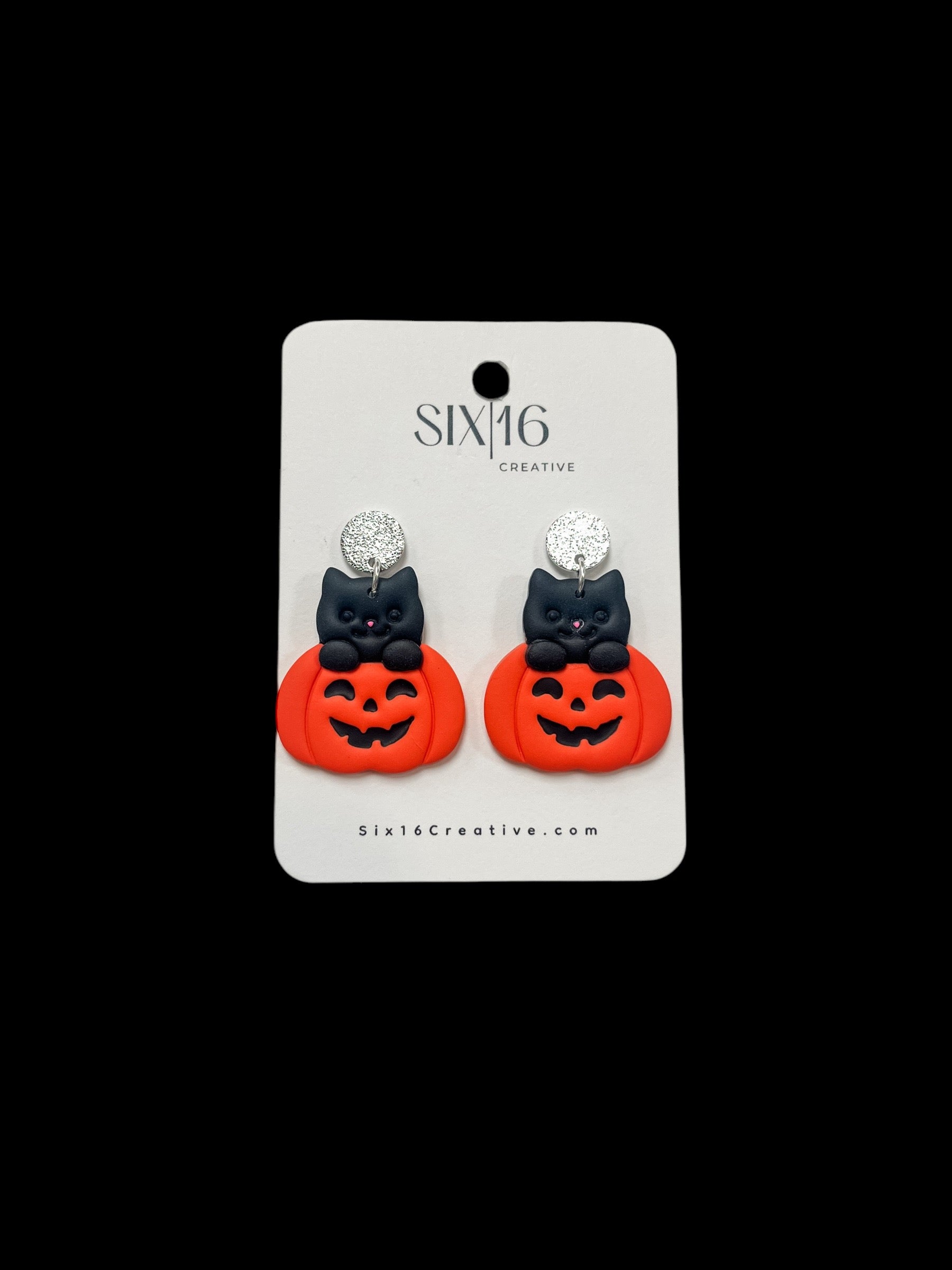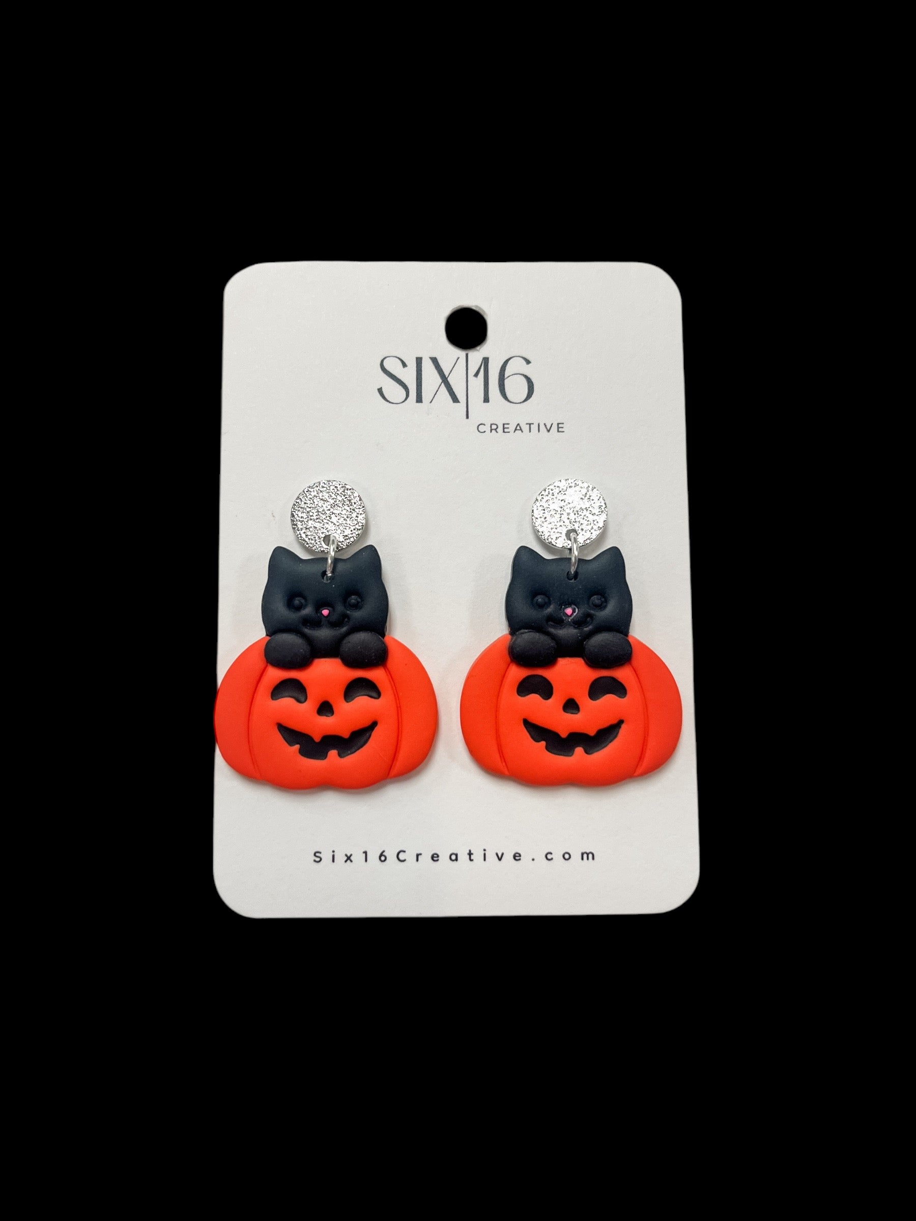Black cat and orange pumpkin polymer clay earrings on a stainless steel silver circle post. Earring length is approximately 1.75 inches.