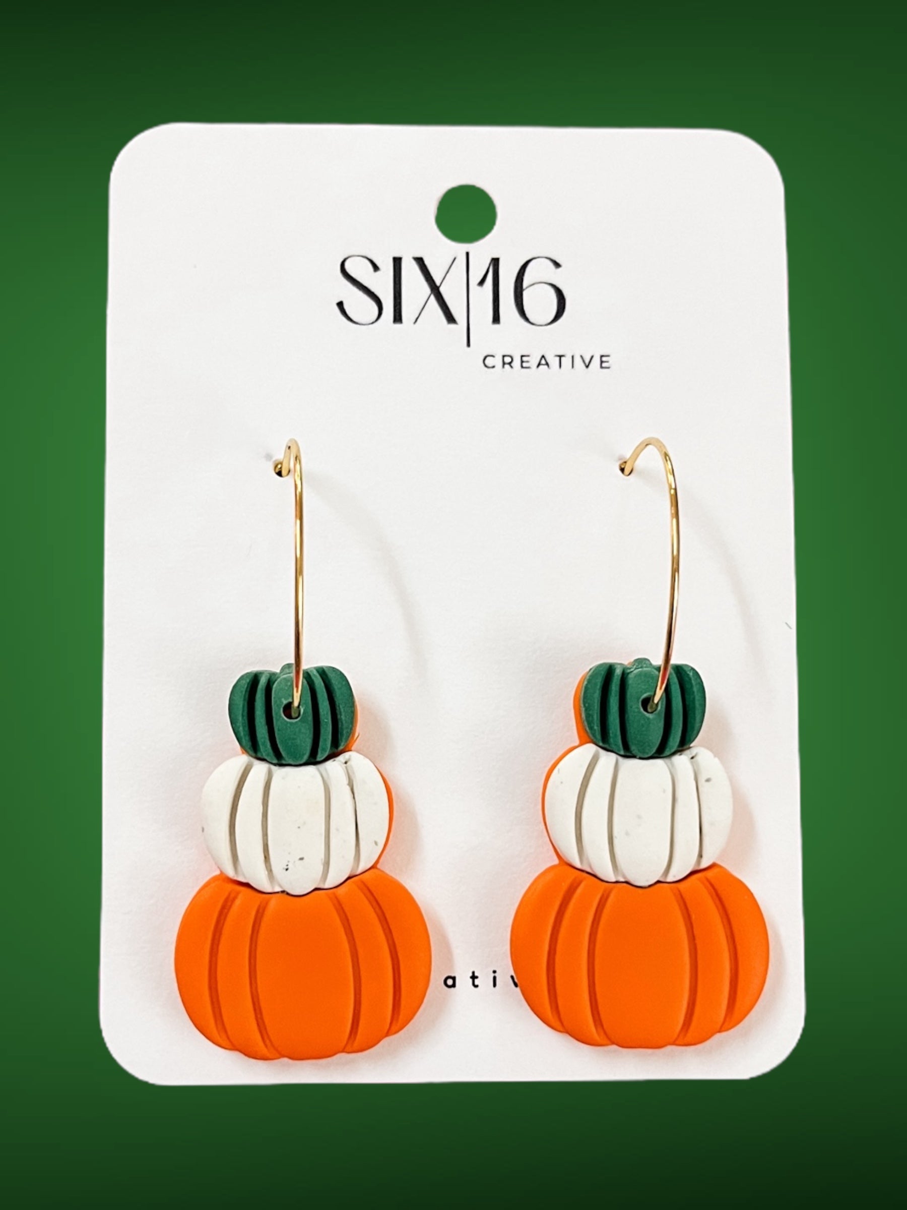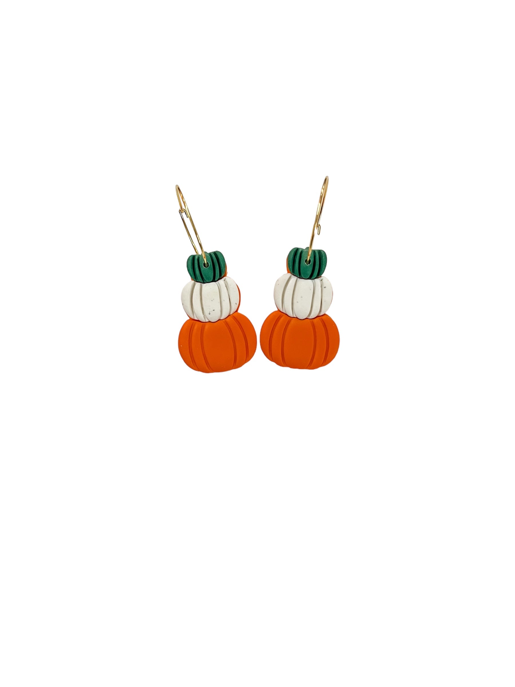 Green, white and orange pumpkin polymer clay earrings on a stainless steel gold hoop. Earring length is approximately 2.5 inches.