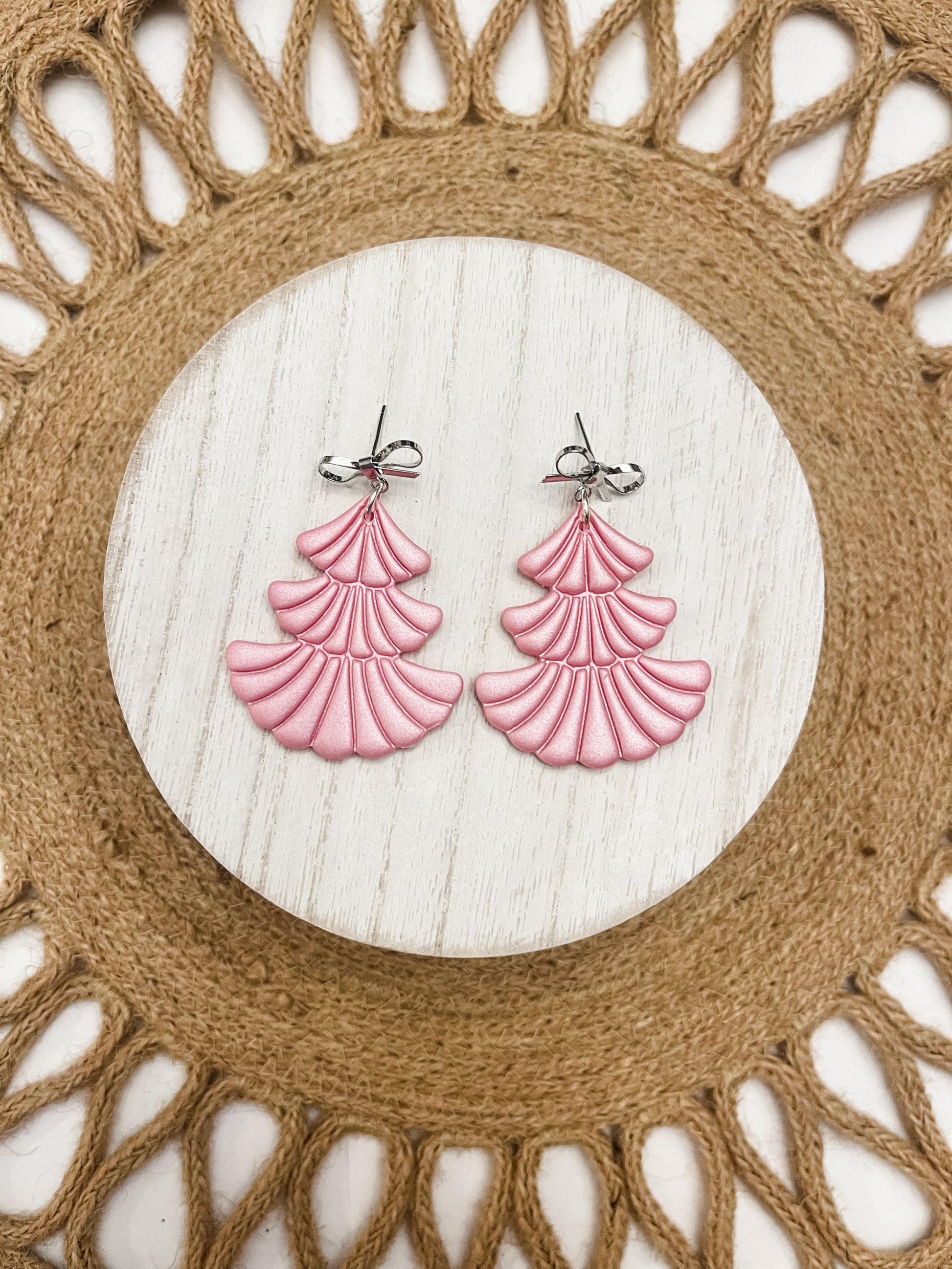 Shimmer pink frilly Christmas tree polymer clay earrings on a silver bow post. Earring length is approximately 2 inches.
