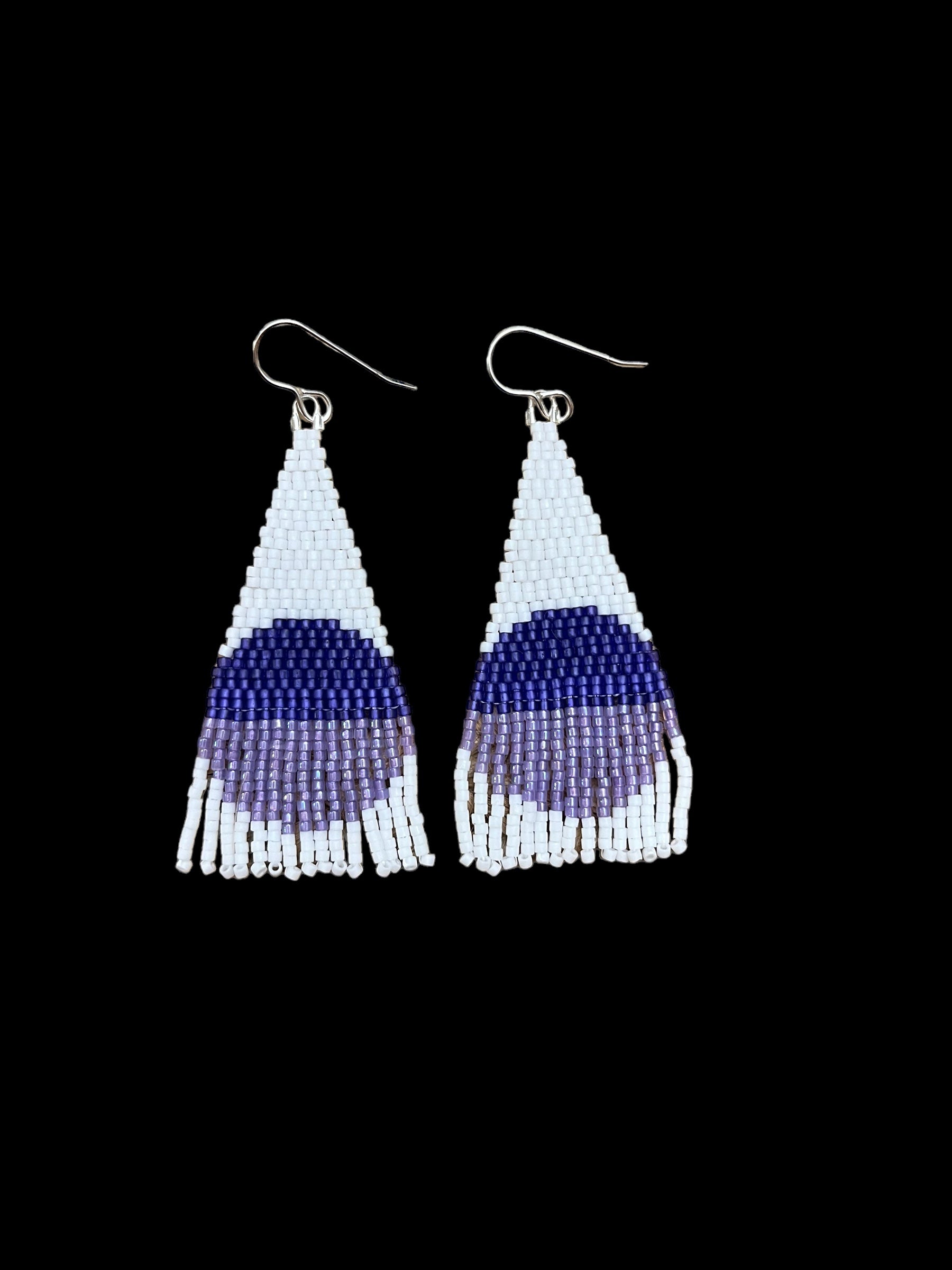 Handmade purple and white beaded earrings with small fringe. The length is approximately 2.5 inches.