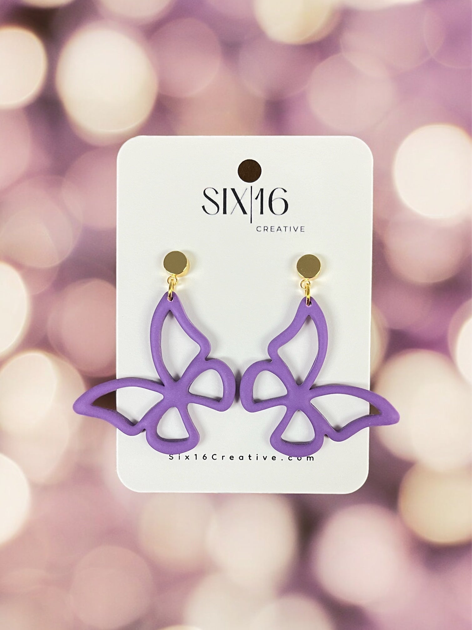 Purple butterfly polymer clay earrings on a gold small circle post. Earring length is approximately 2.5 inches.
