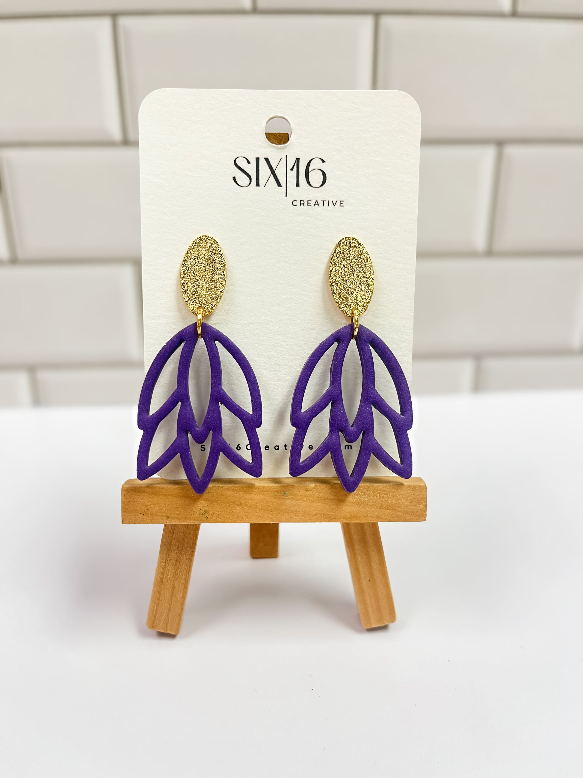 Purple polymer clay earrings on a textured gold oval post. Earring length is approximately 2 inches.