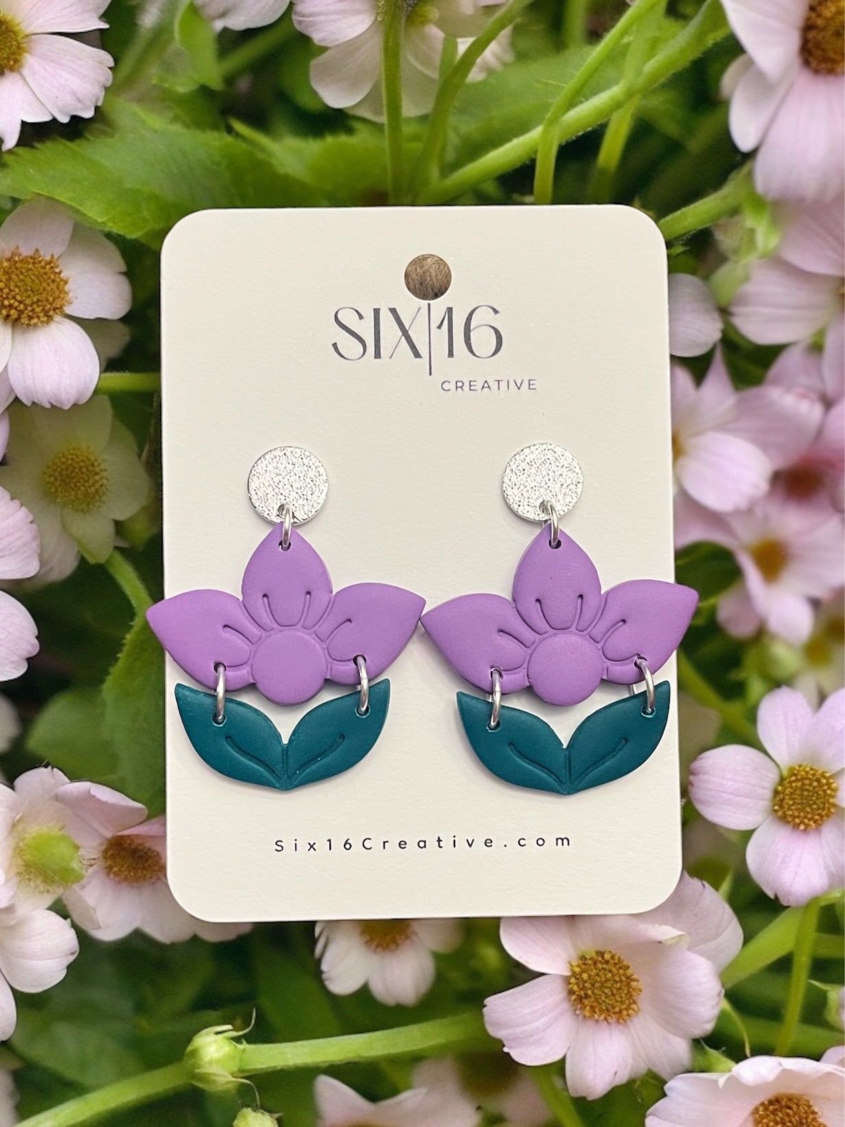 Purple flower with green leaves polymer clay earrings on a small silver circle with a stainless steel post. Earring length is approximately 2 inches.