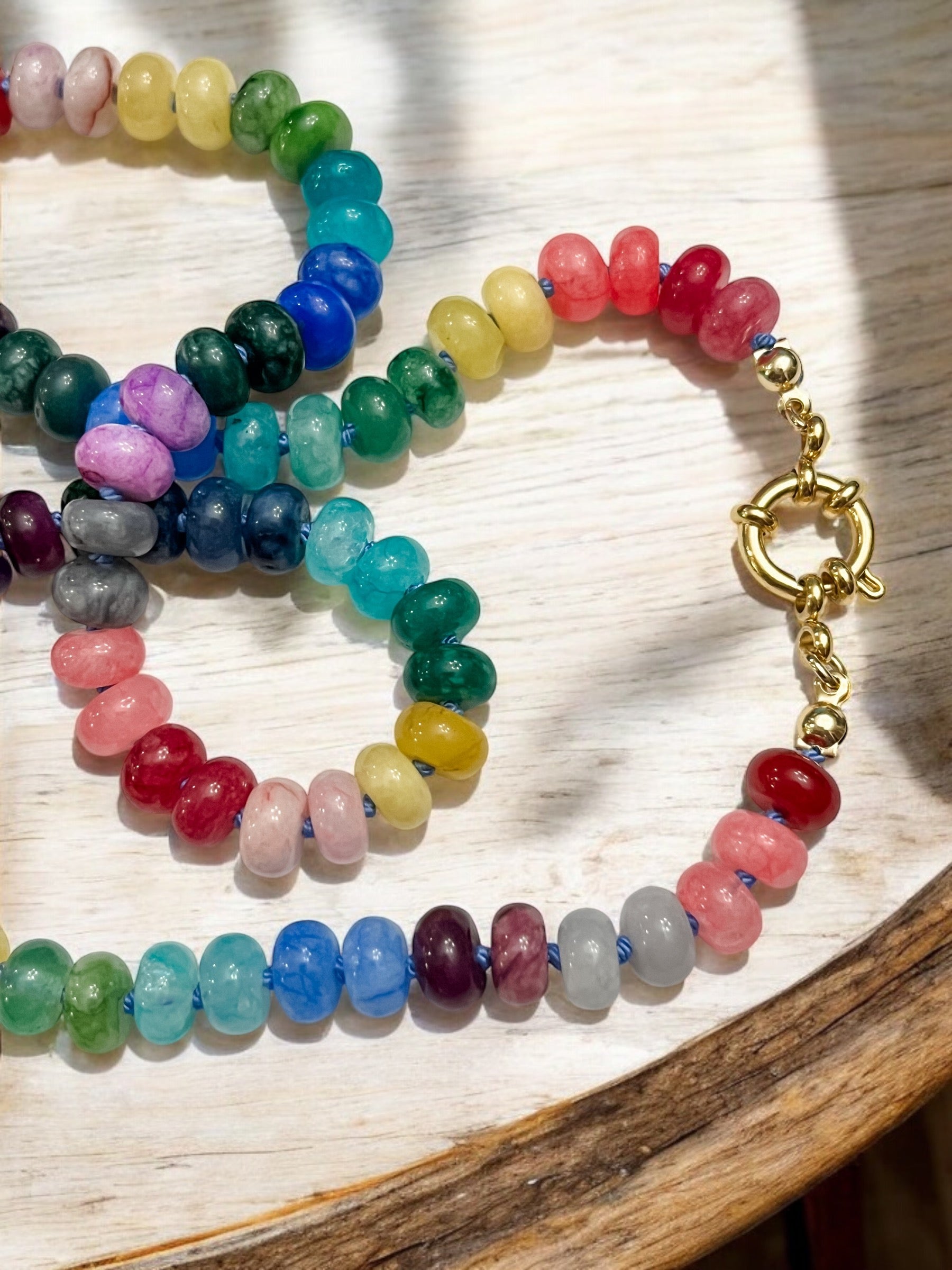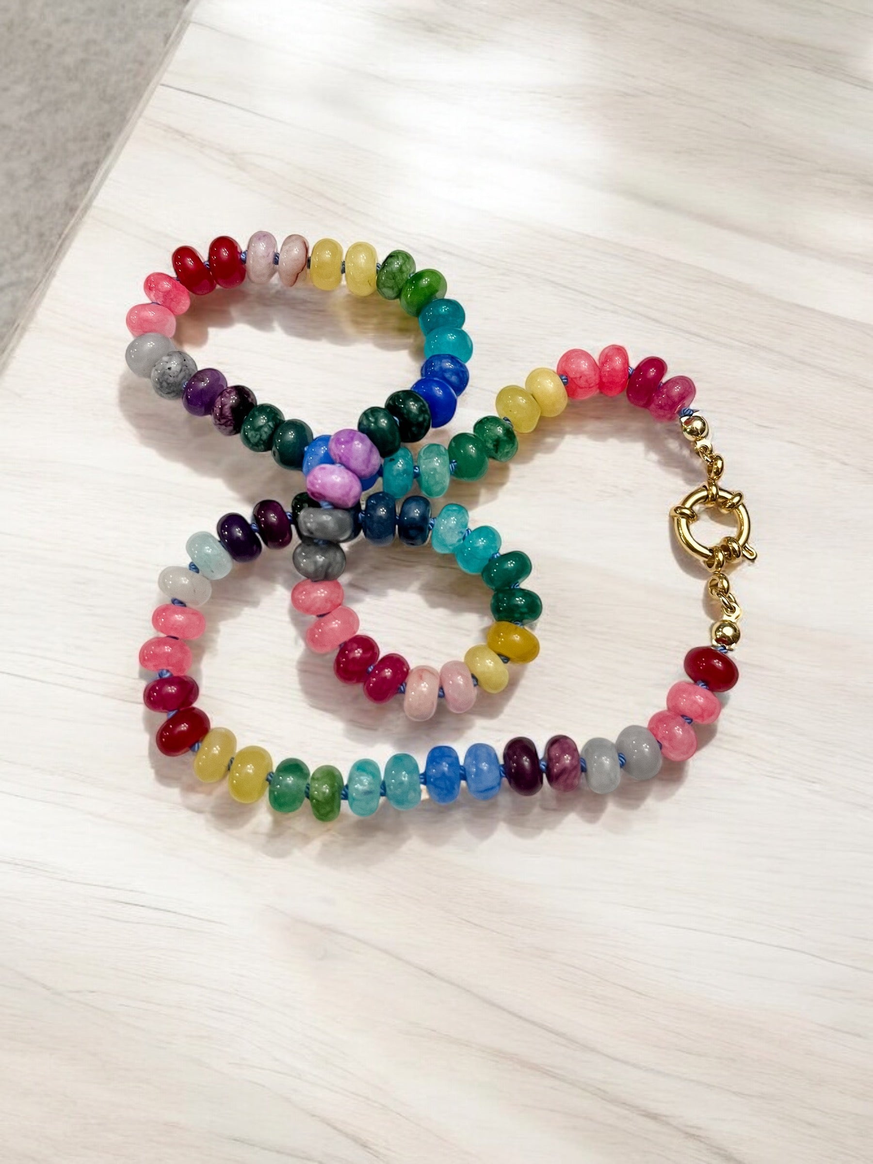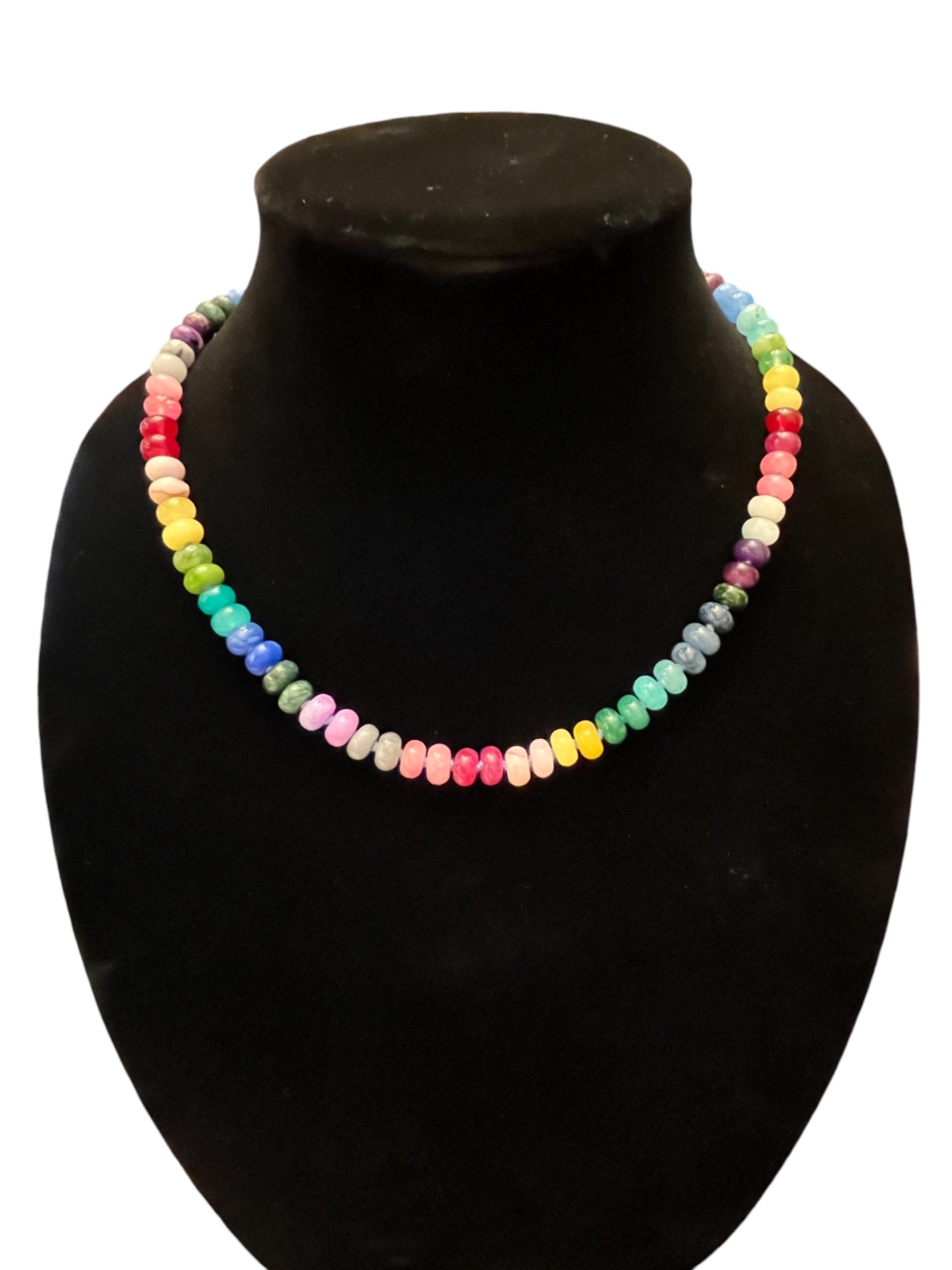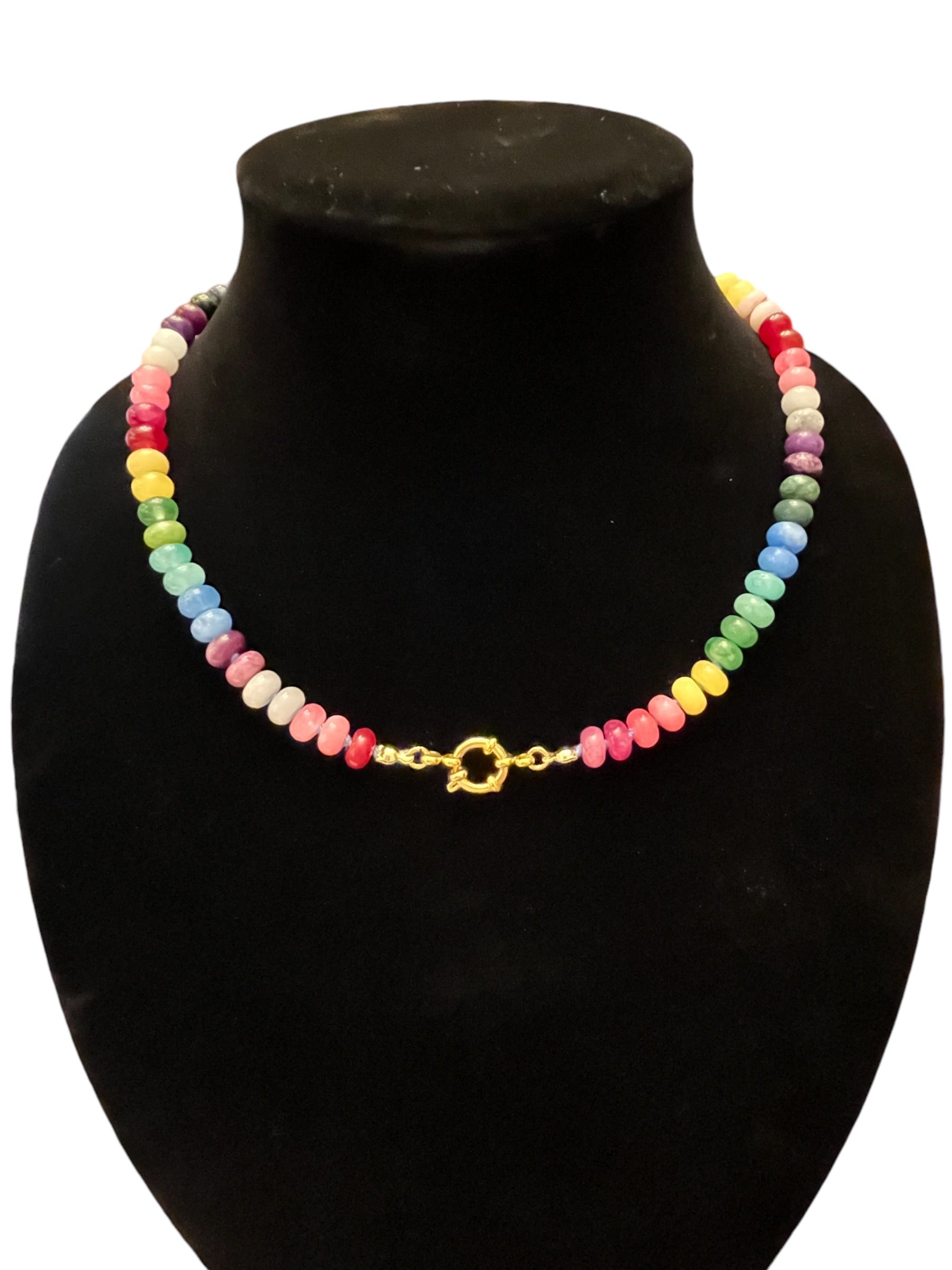 This bright rainbow necklace features a mix of gorgeous gemstone beads that are hand knotted onto a blue silk thread. The necklace comes together with a 18k gold decorative clasp that can be worn in the front, on the side or the back.