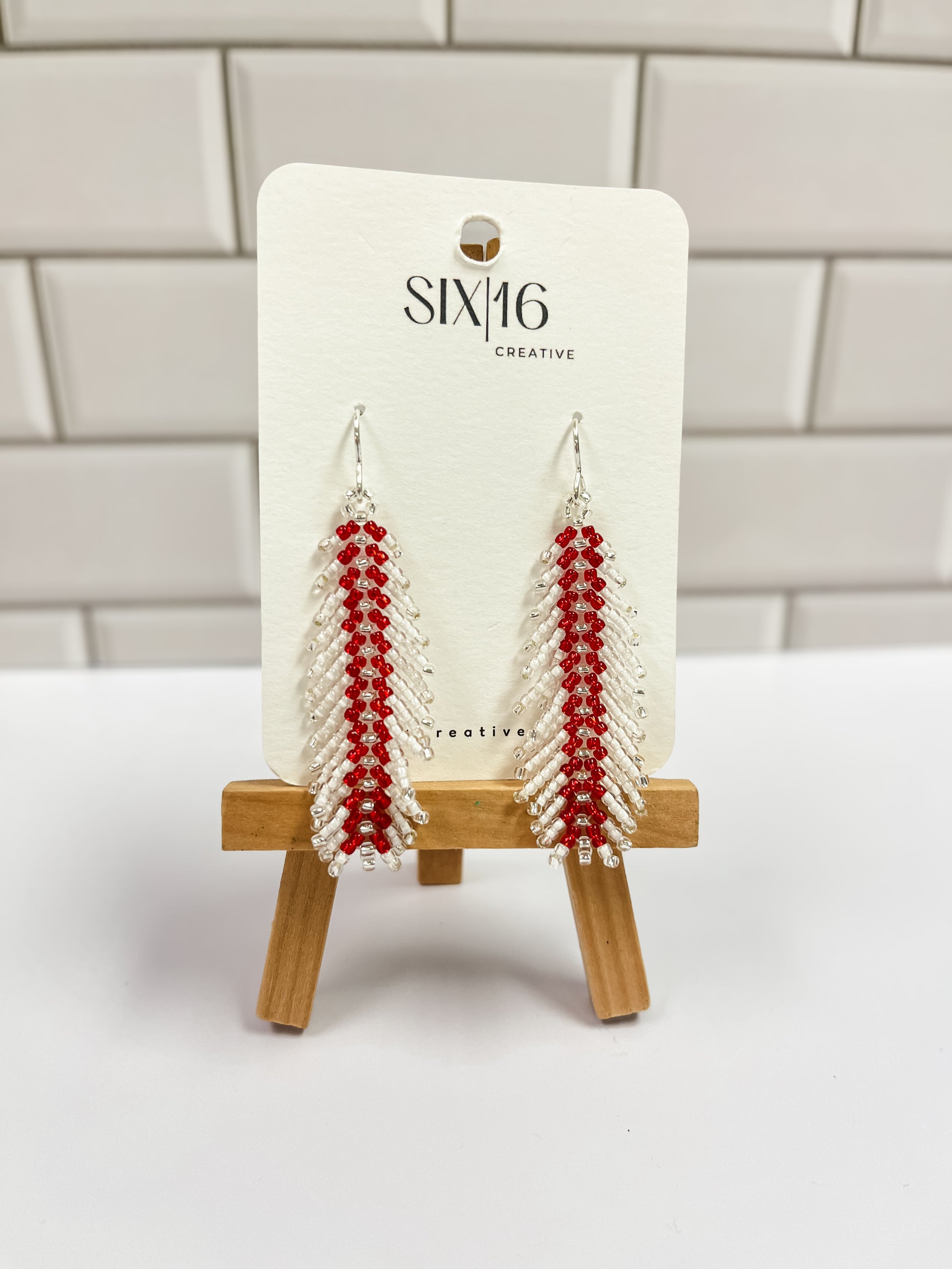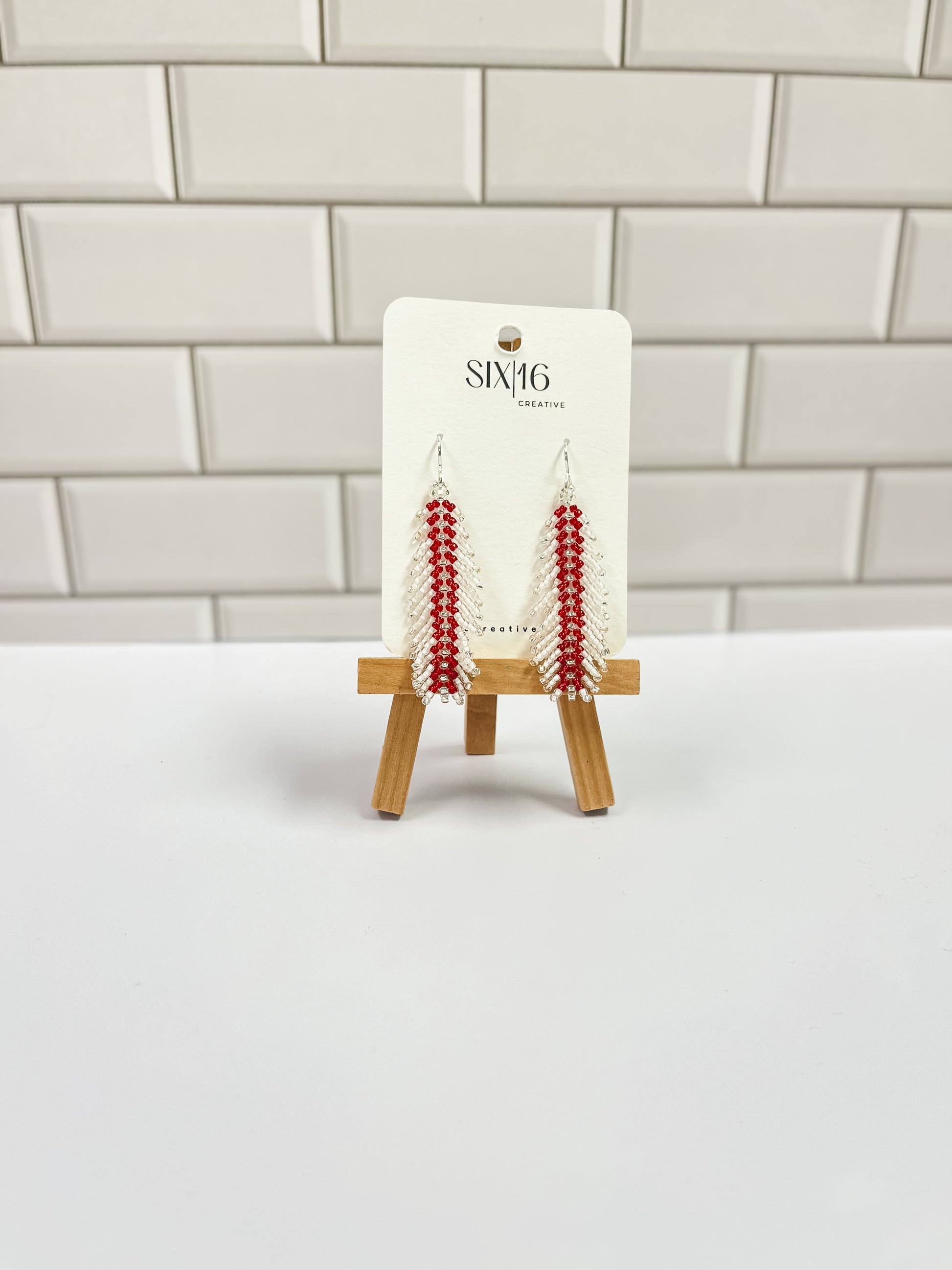 Red and white feather beaded earrings on a silver hook. The length is approximately 2.5 inches.