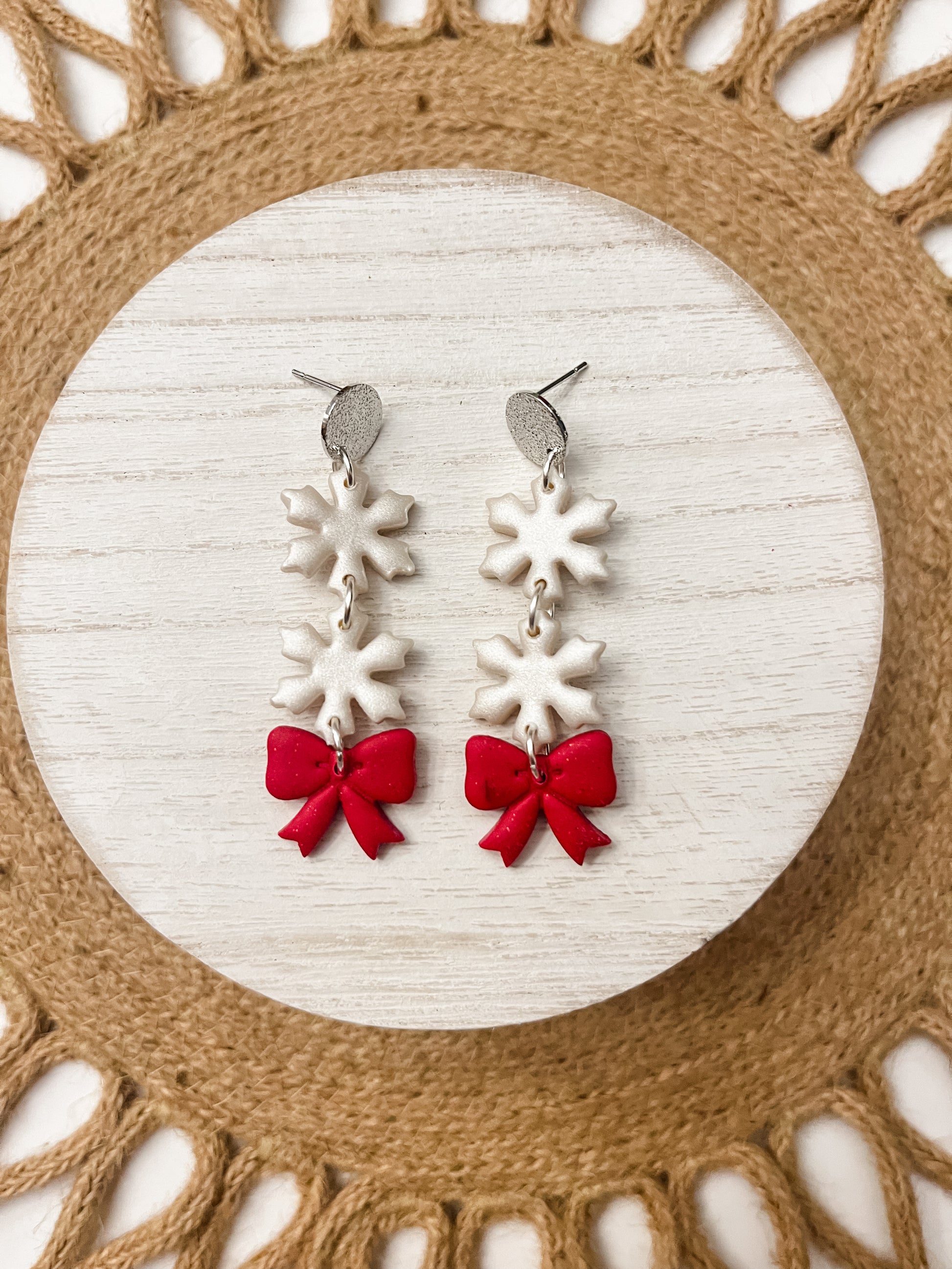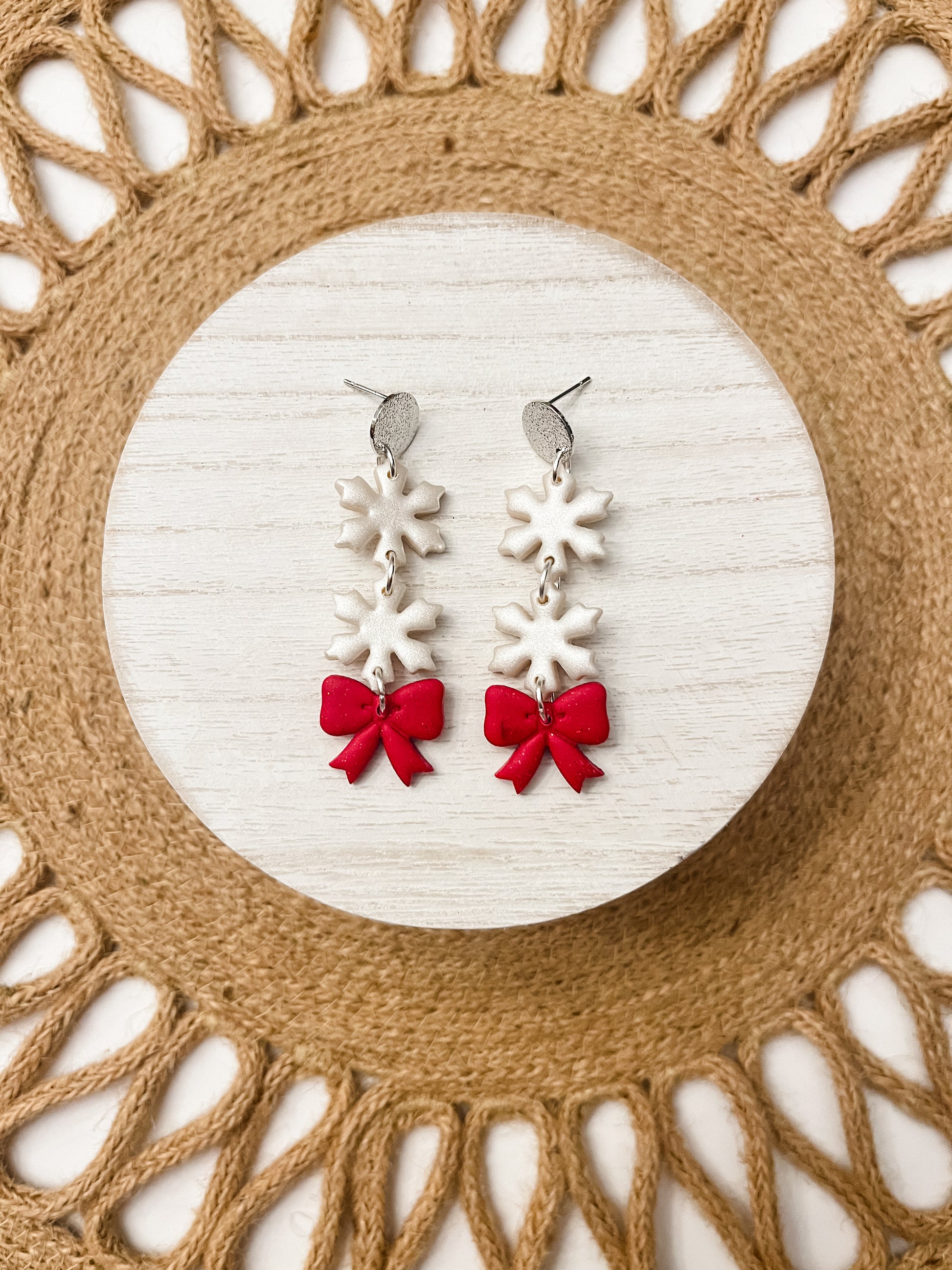 Pearl shimmer snowflakes and red glitter bow polymer clay earrings on a stainless steel silver circle. Earring length is approximately 2.5 inches.