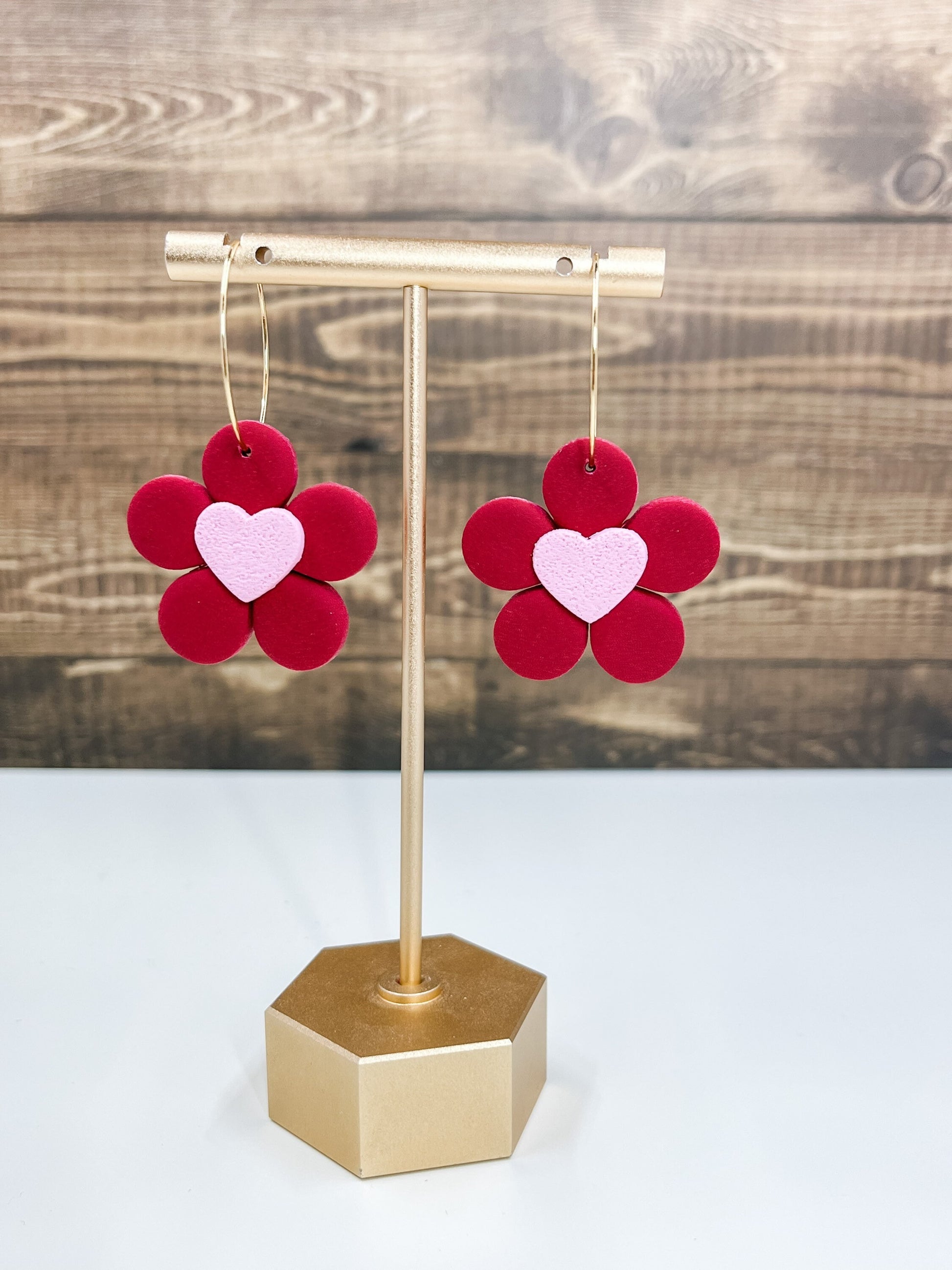 Red and pink flower and heart polymer clay earrings on a stainless steel gold hoop. Earring length is approximately 1.75 inches.