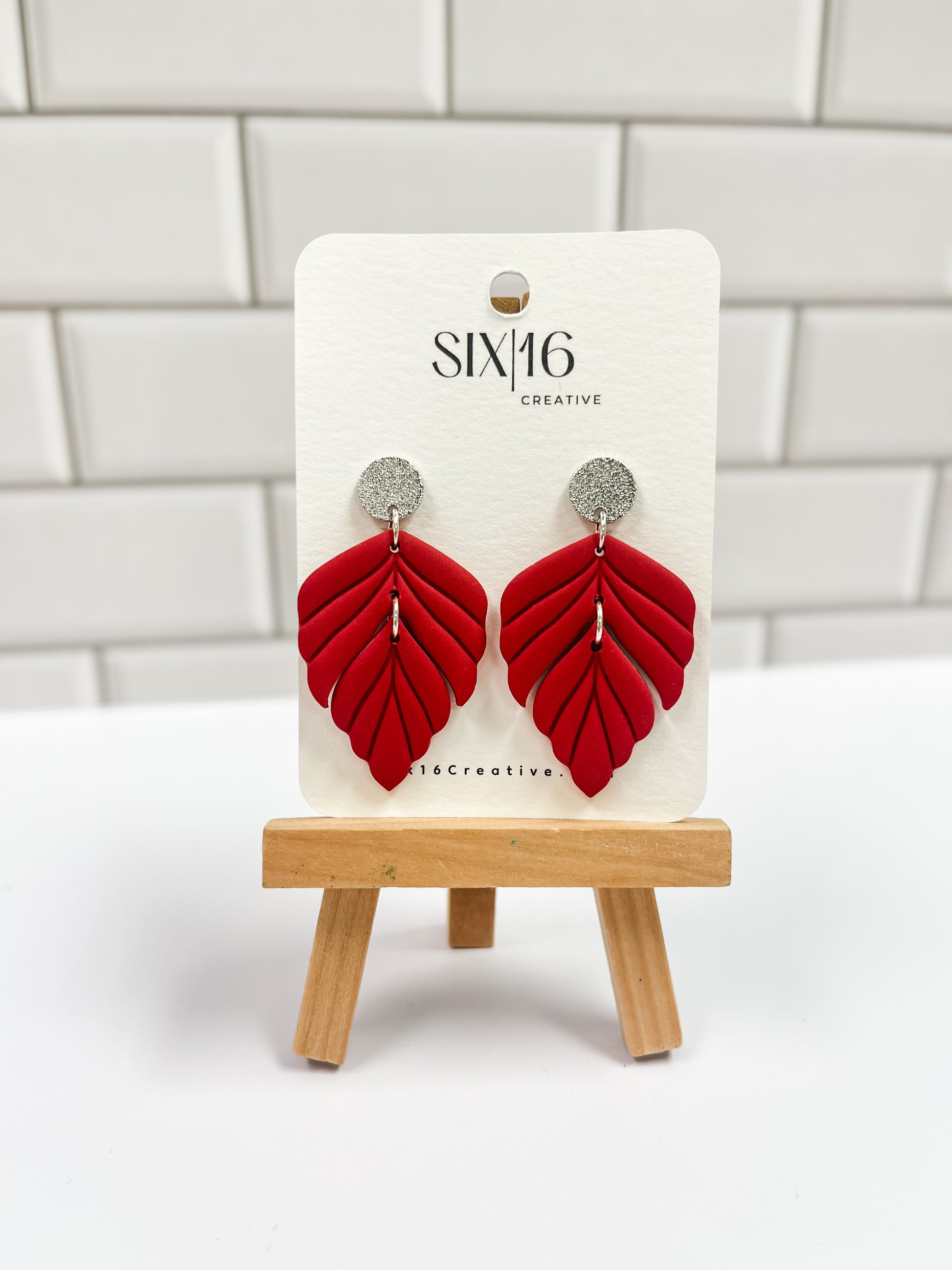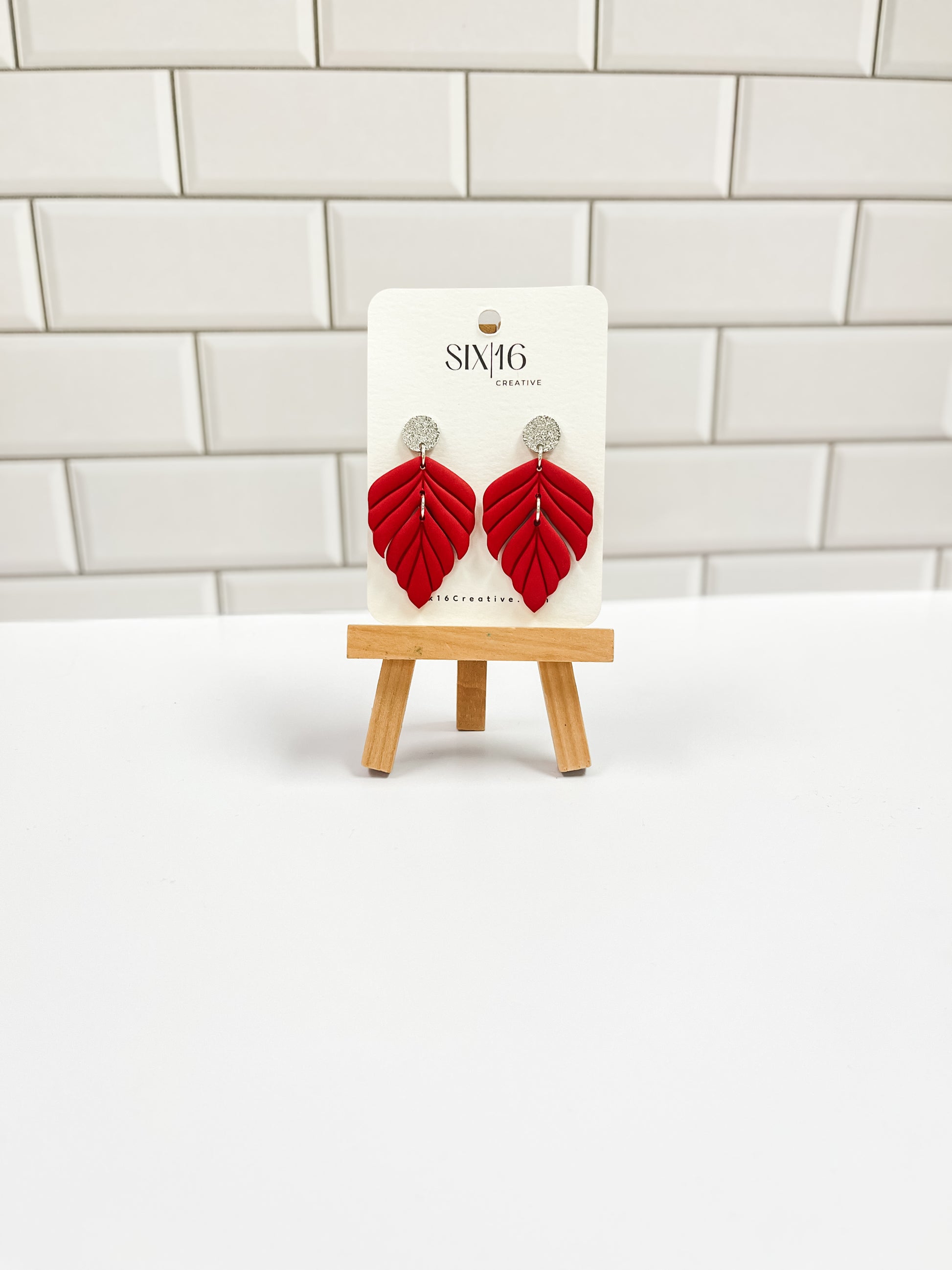 Red leaf polymer clay earrings on a textured silver circle post. Earring length is approximately 2 inches.