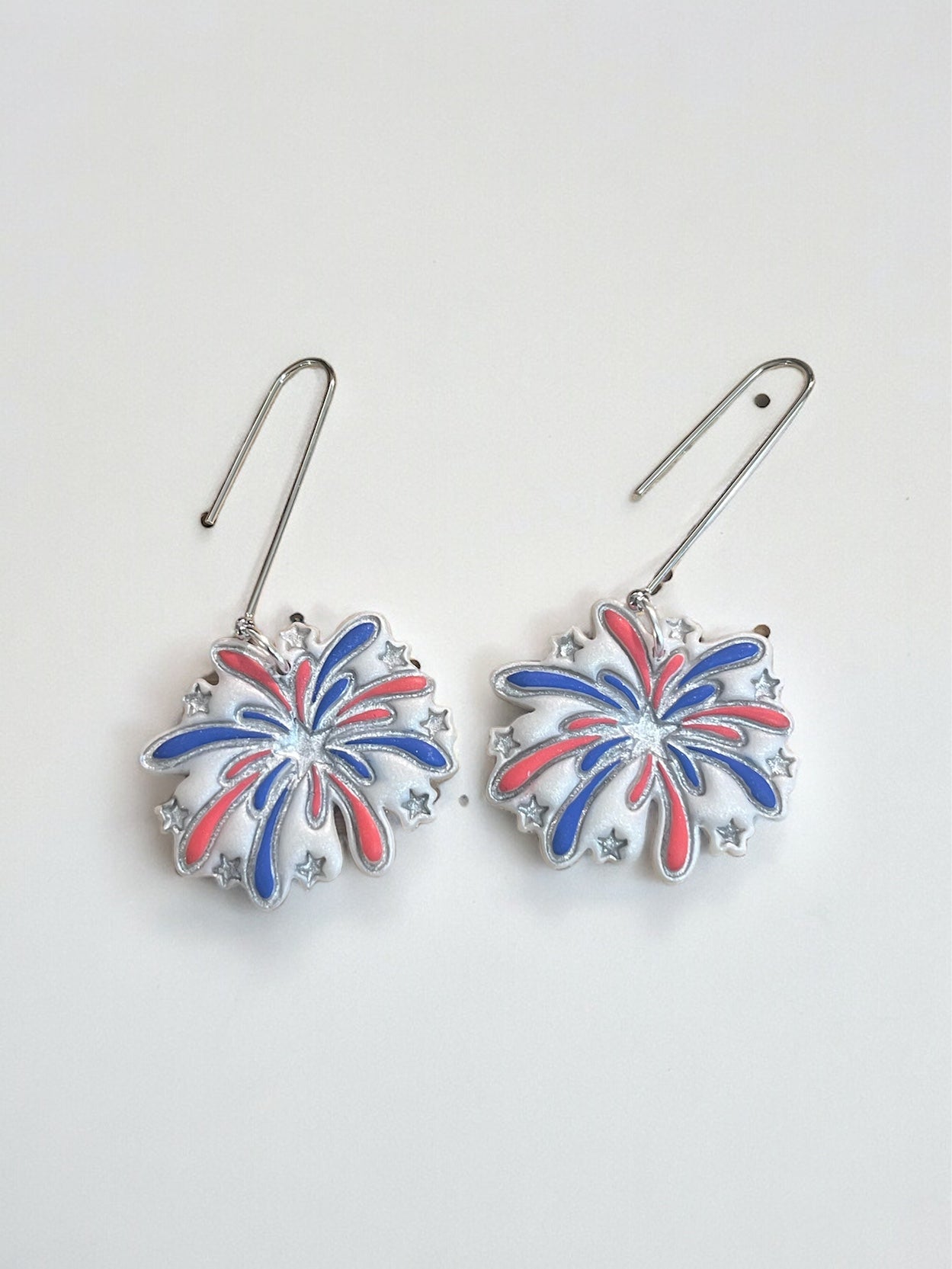 Red, white and blue fireworks polymer clay earrings on a stainless steel silver hook. Earrings are approximately 2.5 inches long.