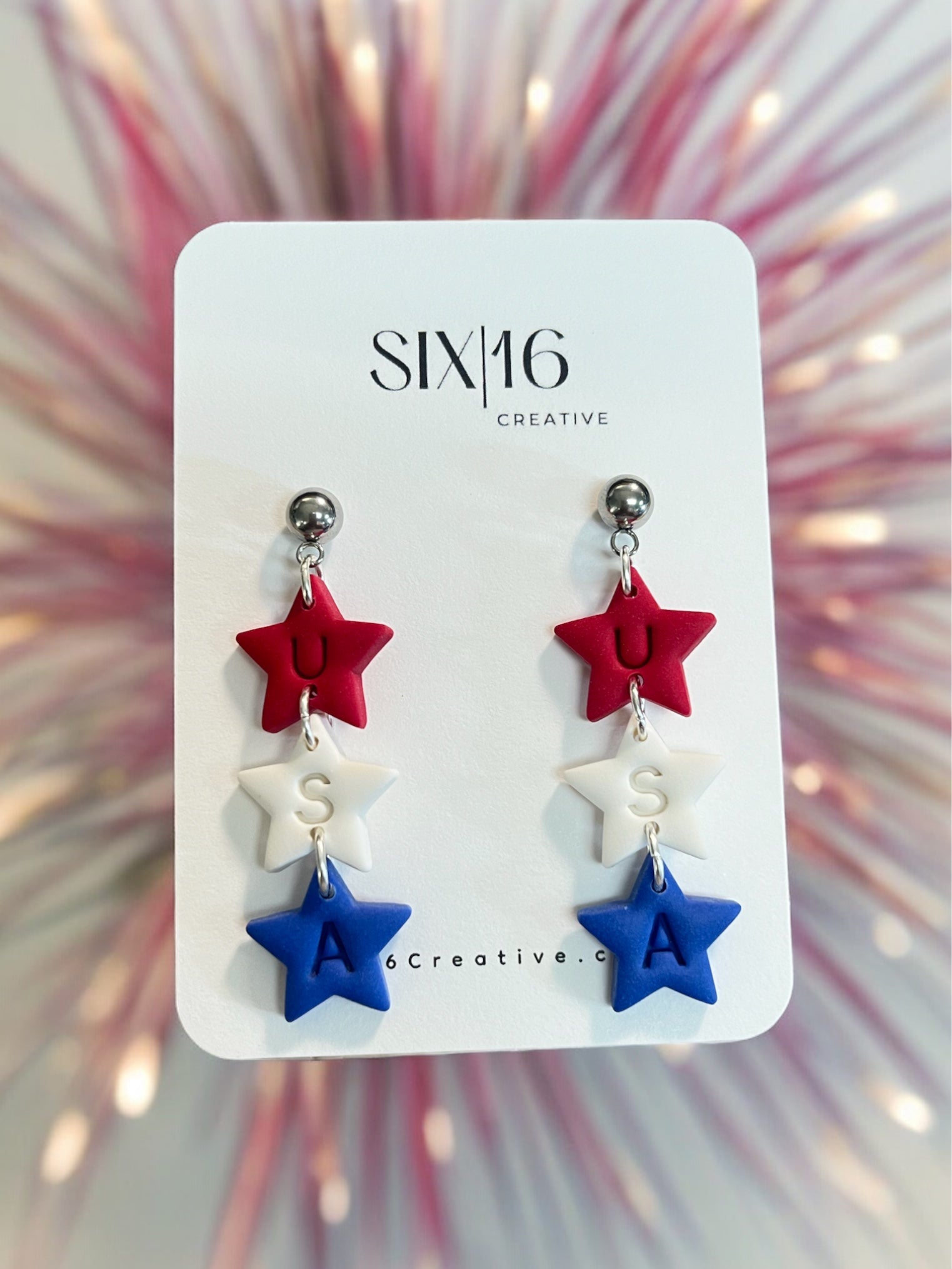 Red, white and blue USA polymer clay earrings on a stainless steel silver ball post. Earrings are approximately 2.25 inches long.