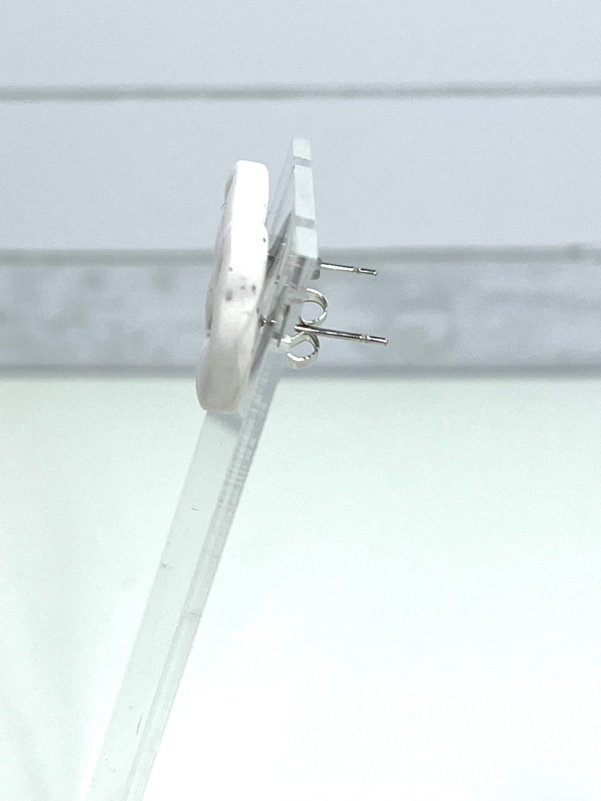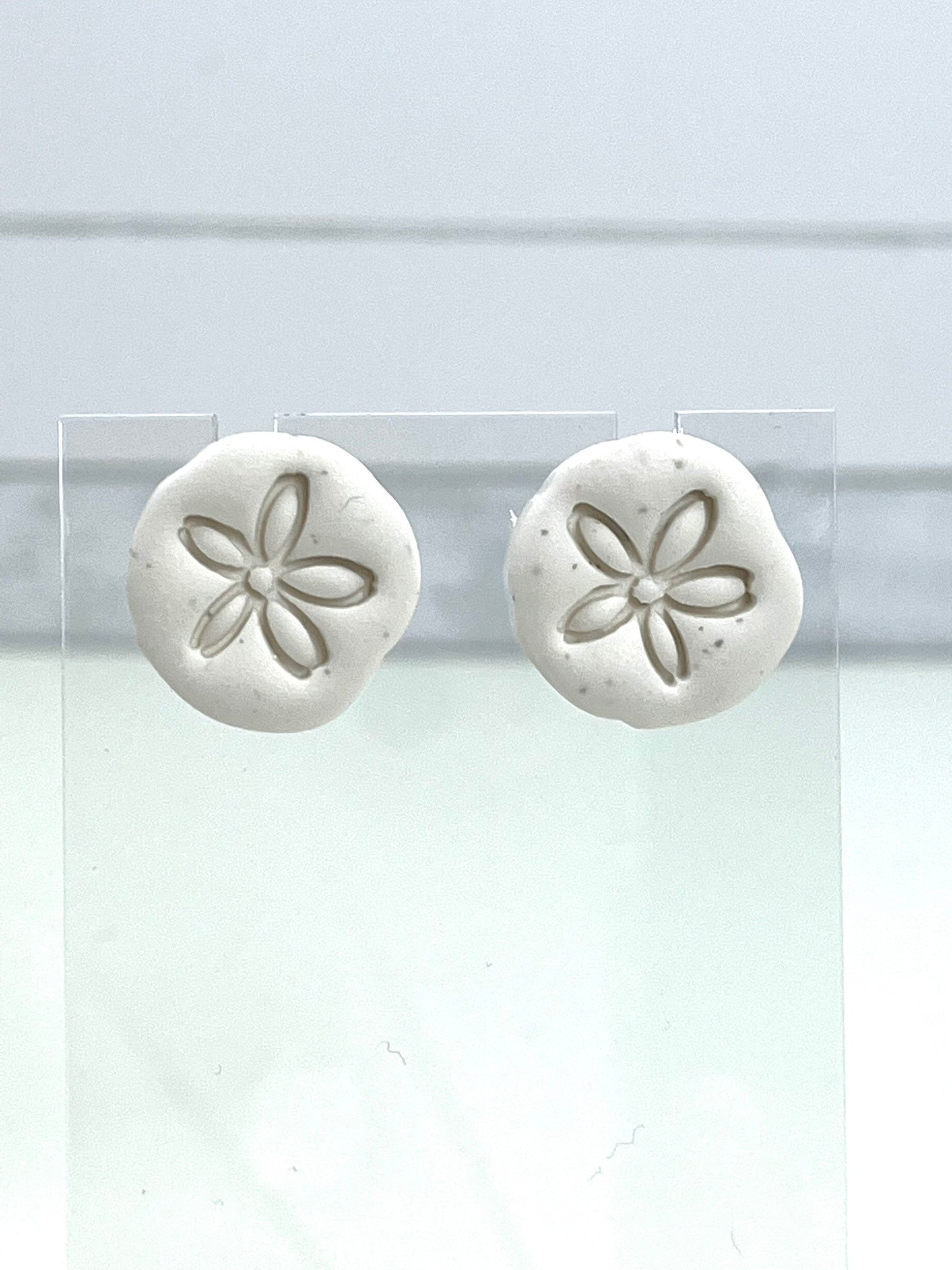 Speckled white sand dollar polymer clay stud earrings on a stainless steel post.