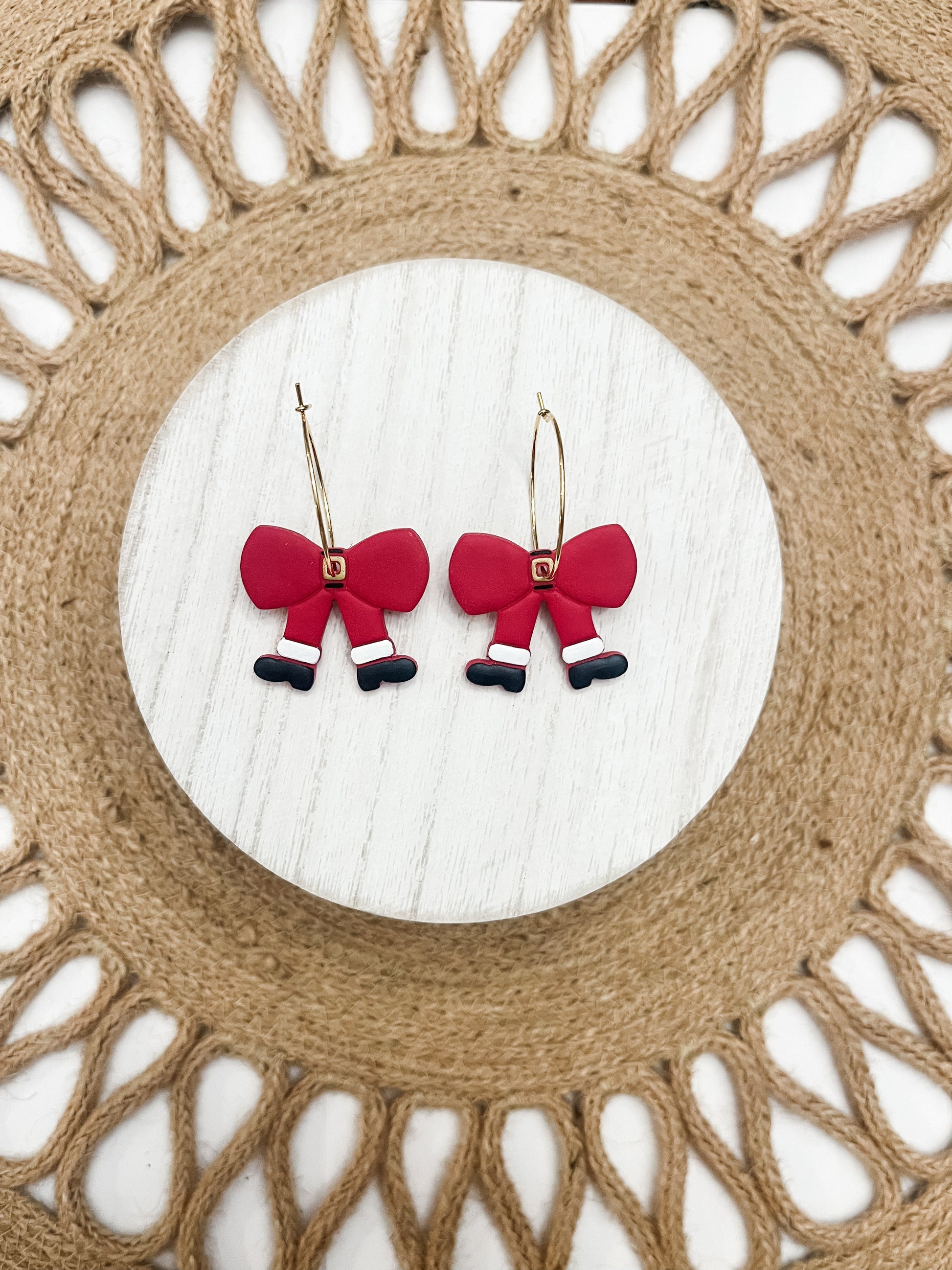 Santa bow polymer clay earrings on a stainless steel gold hoop. Earring length is approximately 2 inches.