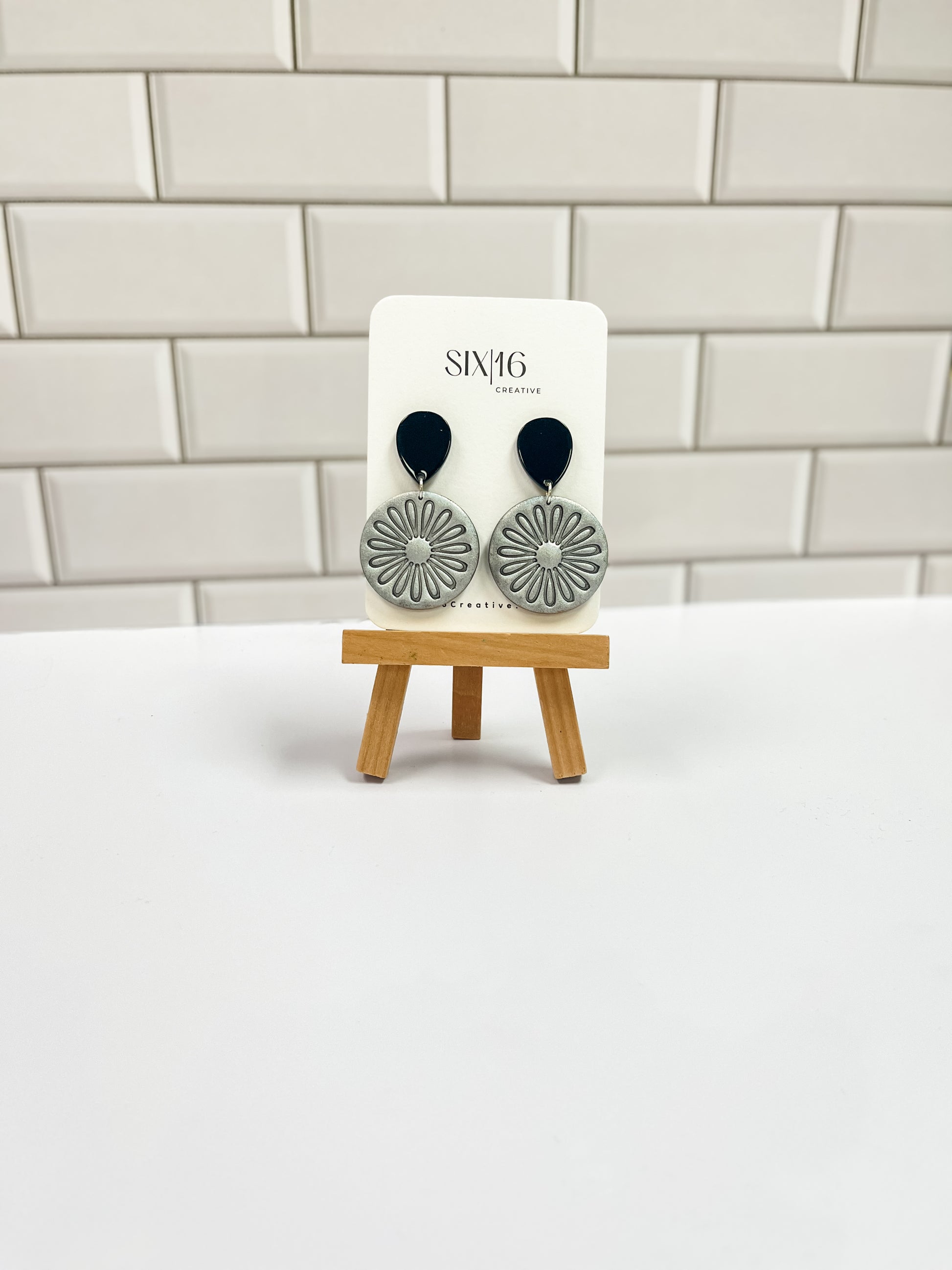 Silver circle with flower detail polymer clay earrings on a black acrylic teardrop with stainless steel post. Earring length is approximately 2 inches.