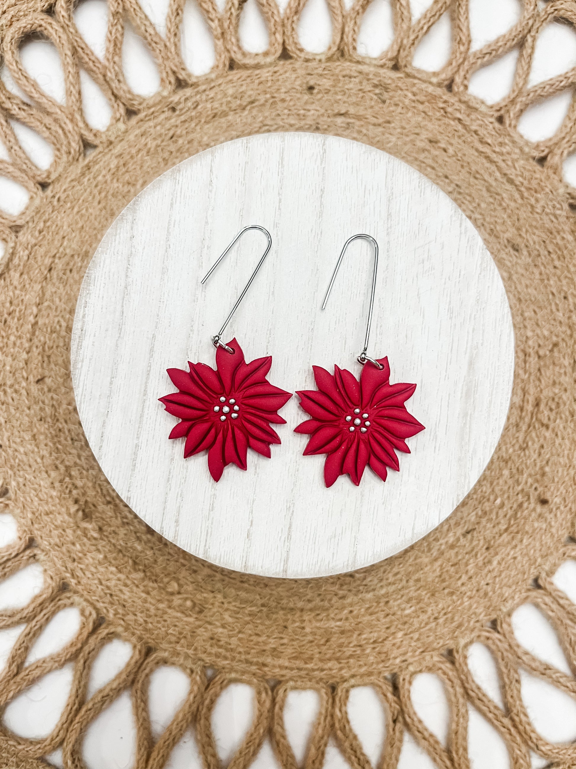 Poinsettia polymer clay earrings on a stainless steel long silver hook. Earring length is approximately 2.5 inches.