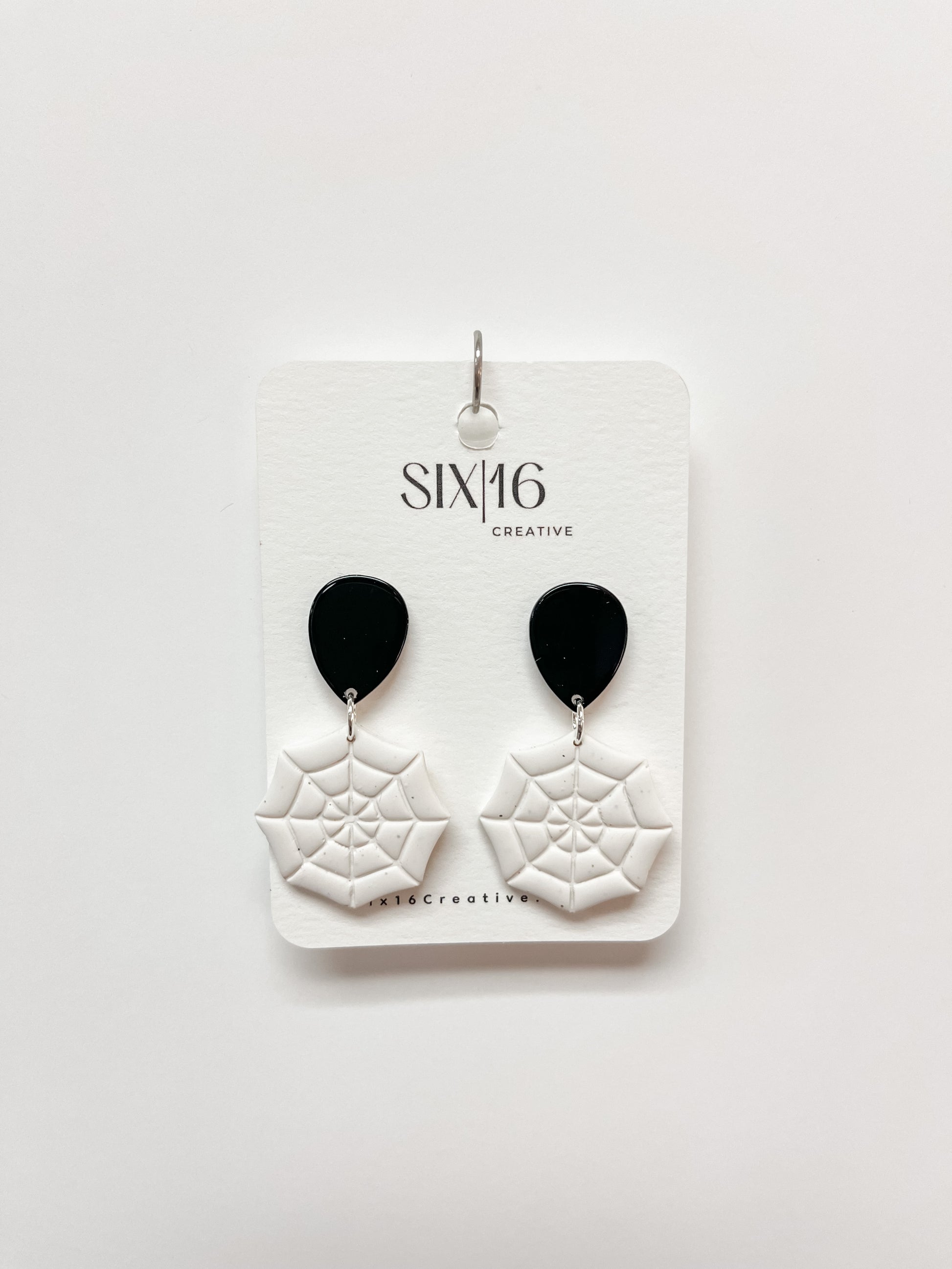 Speckled white spider web polymer clay earrings on a black acrylic teardrop. Earring length is approximately 1.5 inches.