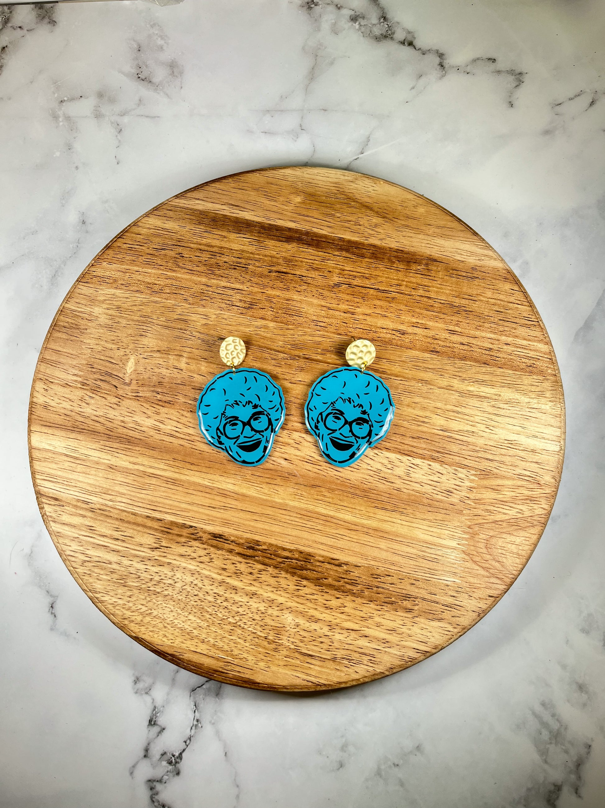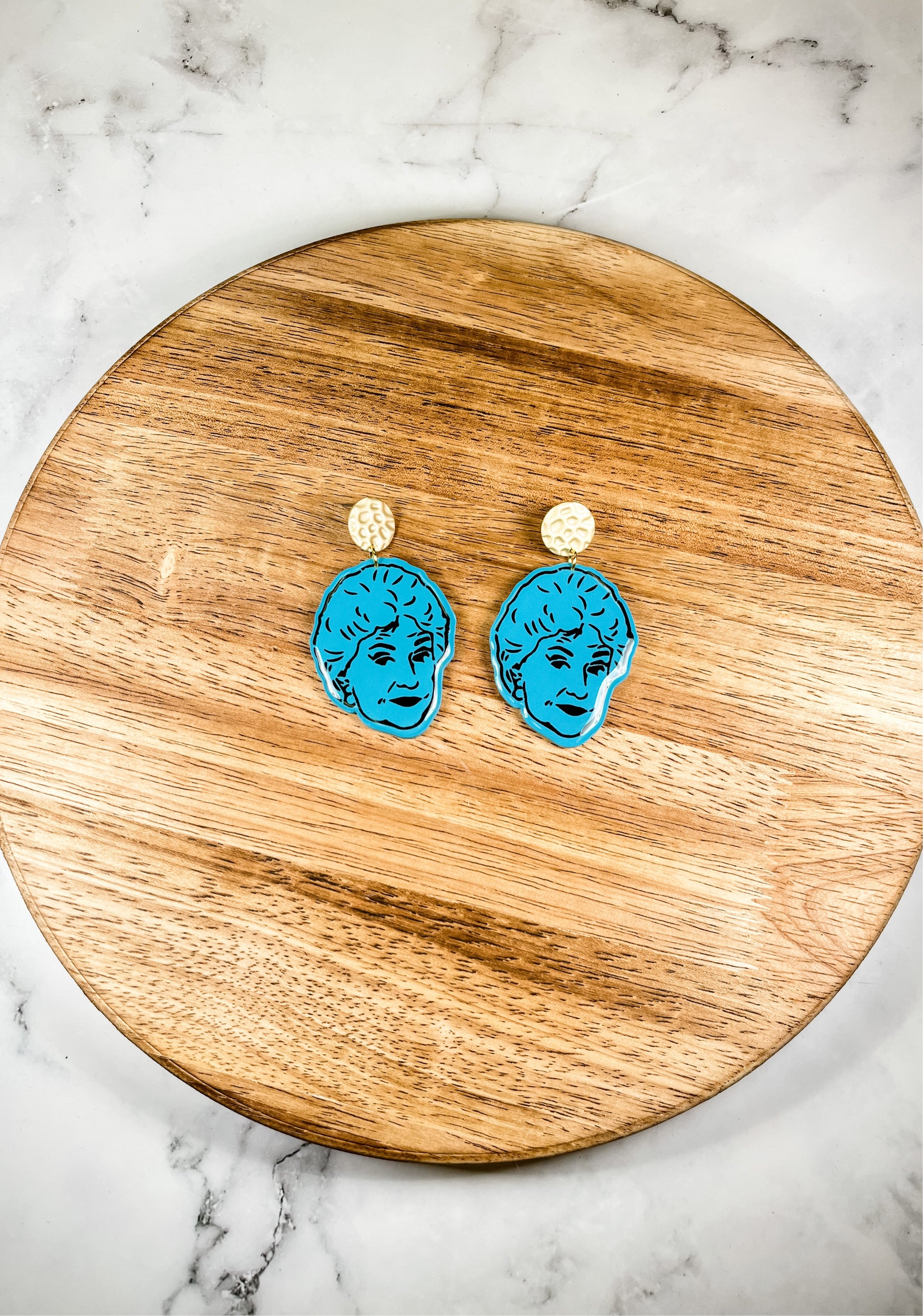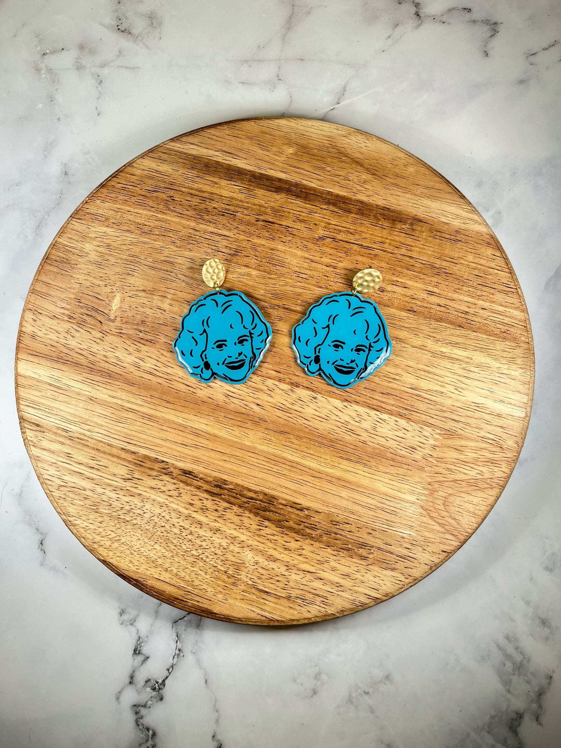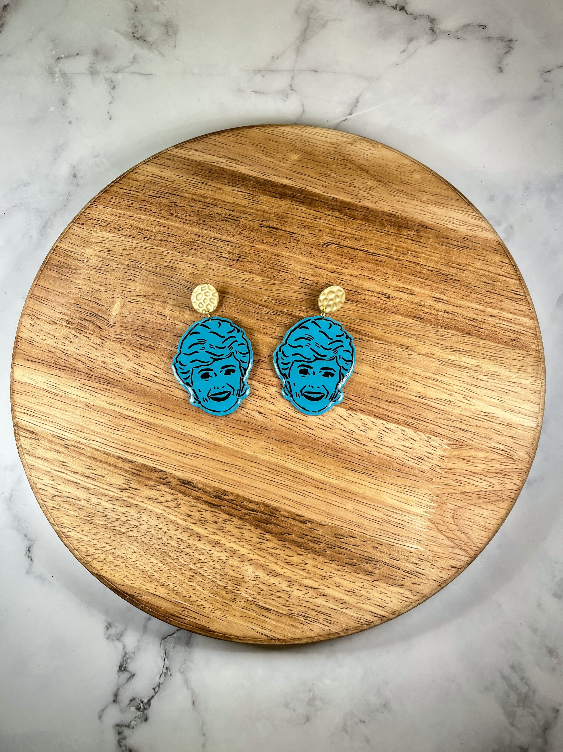 Stay golden earrings featuring your 4 favorite ladies from Miami. The earrings hang from a textured gold post. Measurement photos are in the listing for each character.