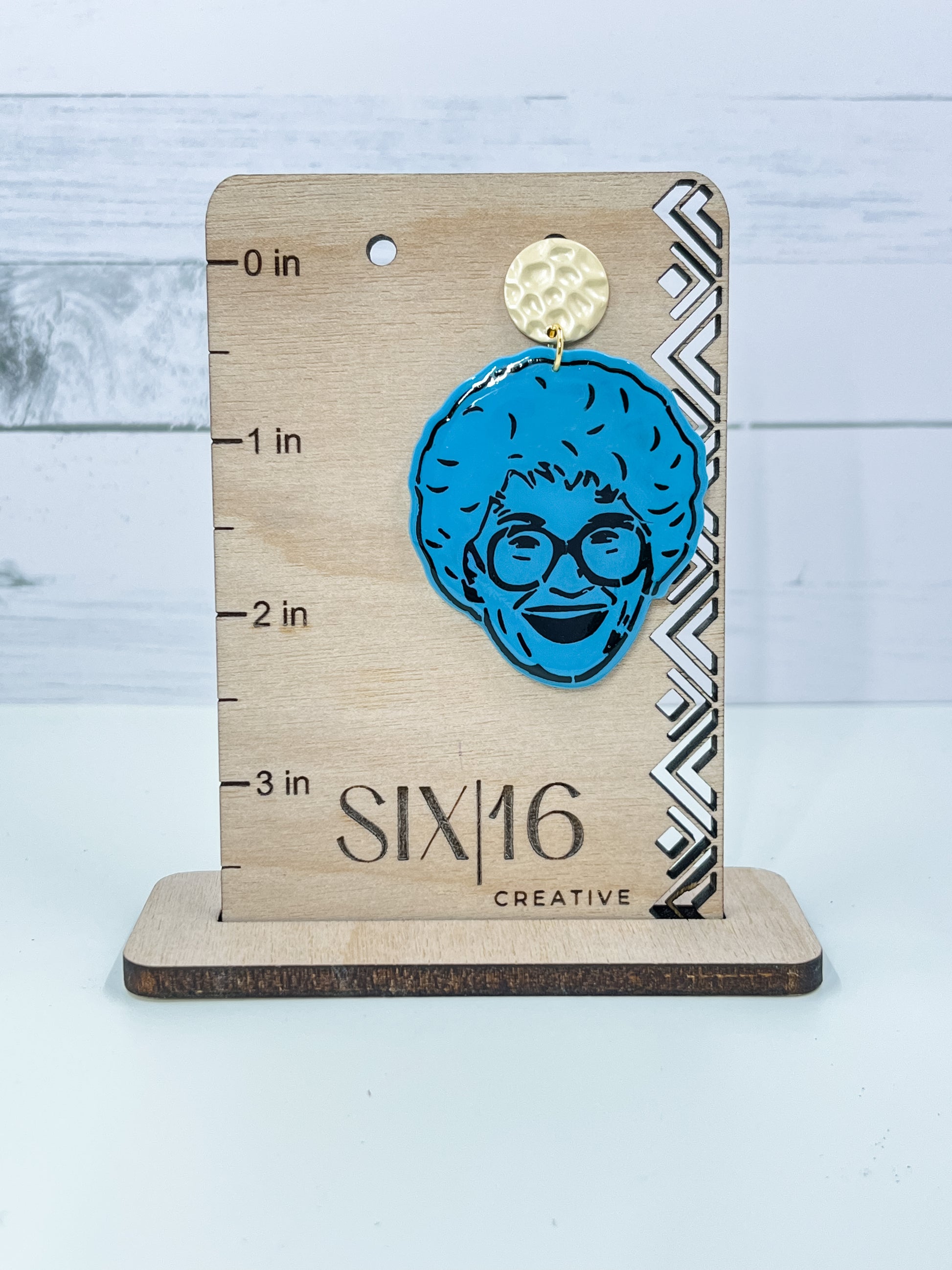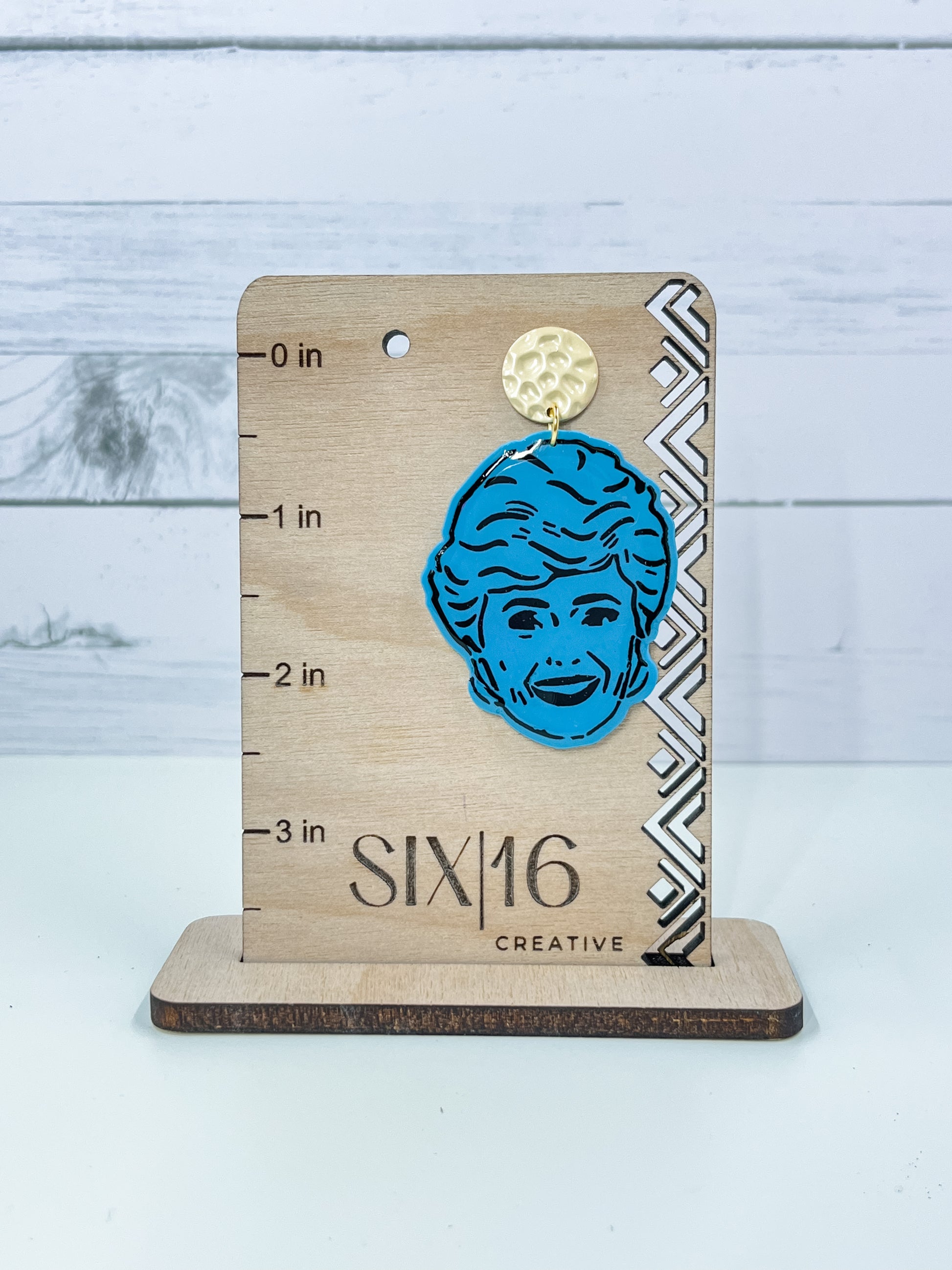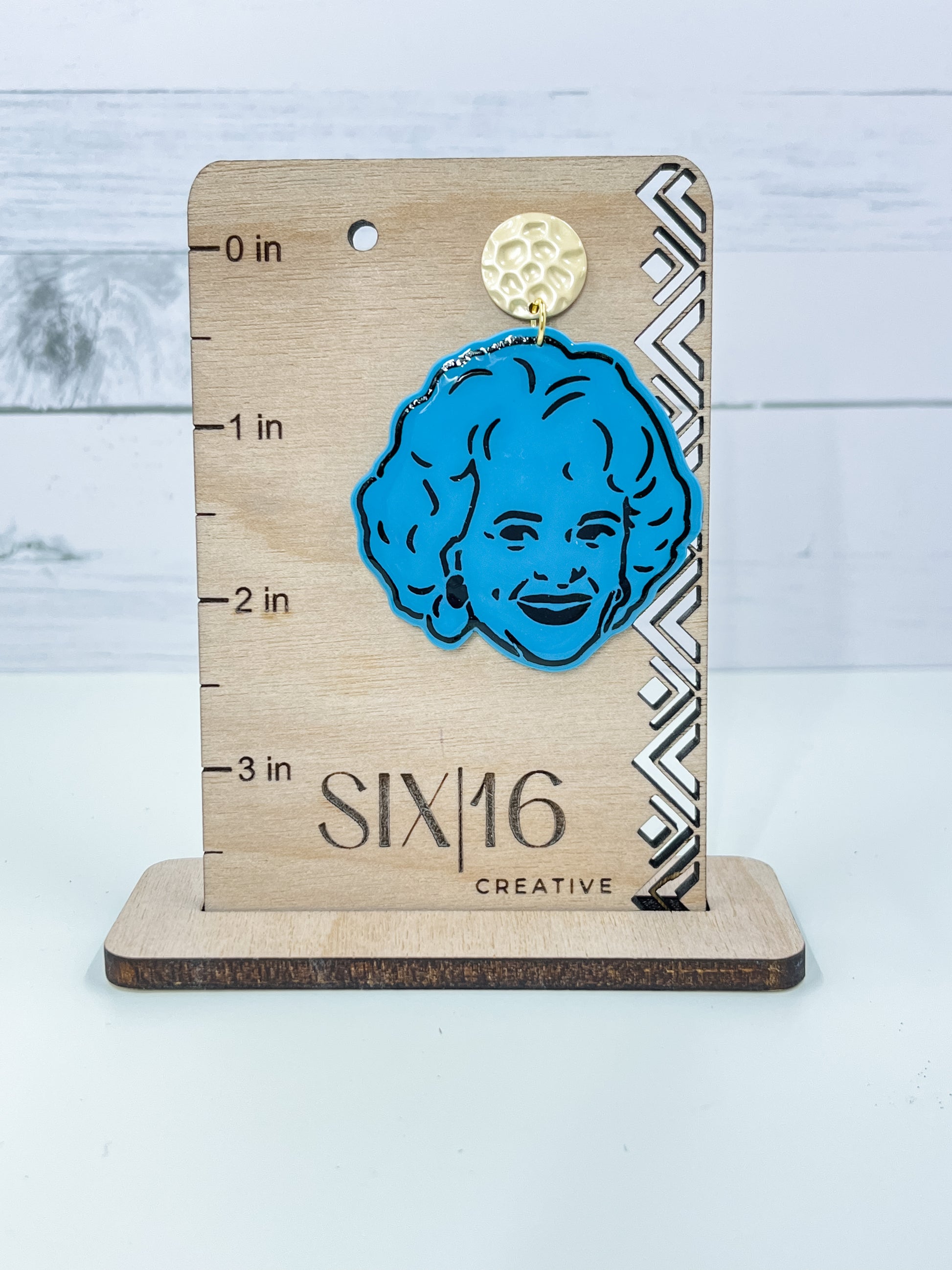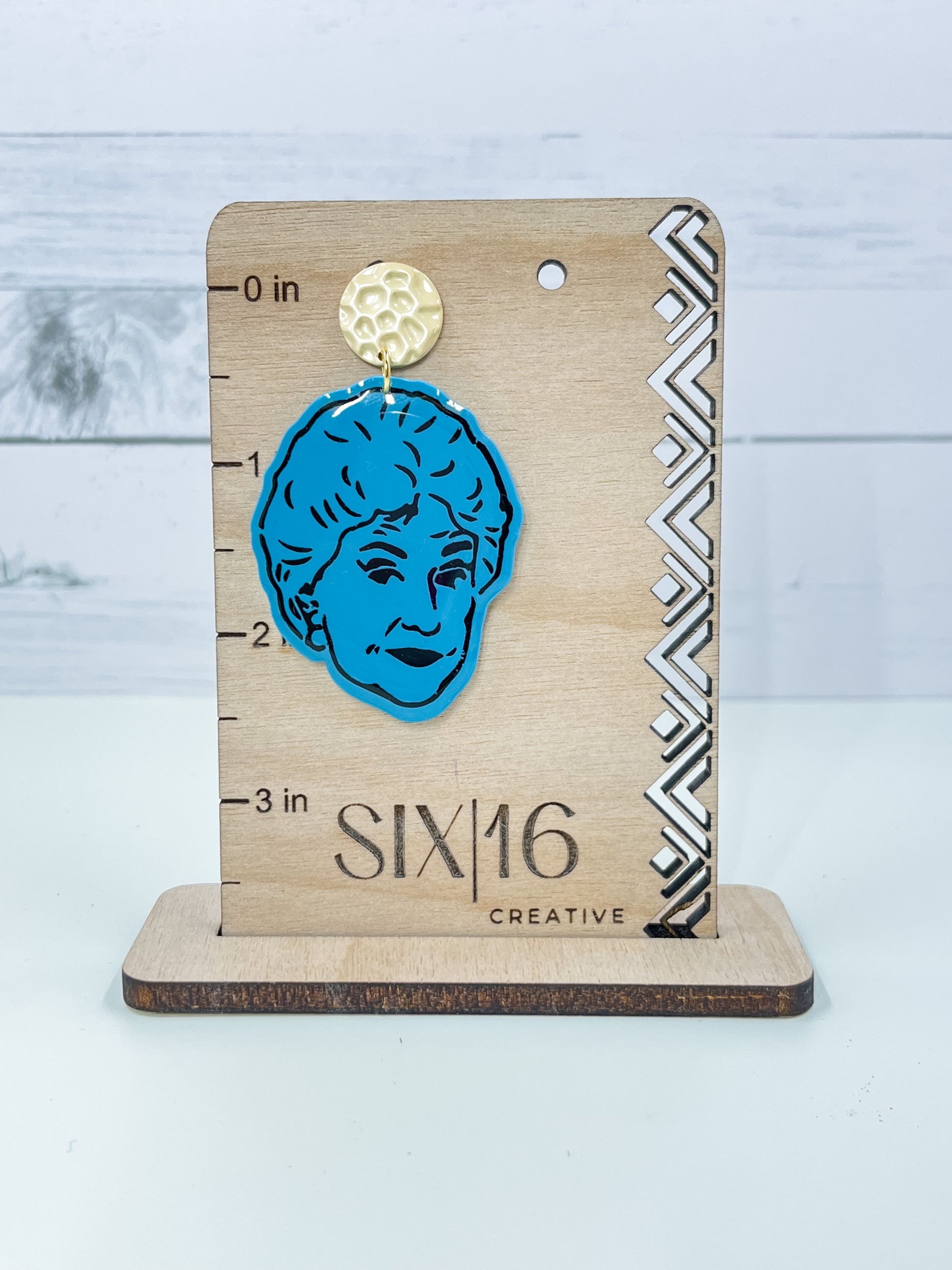 Stay golden earrings featuring your 4 favorite ladies from Miami. The earrings hang from a textured gold post. Measurement photos are in the listing for each character.
