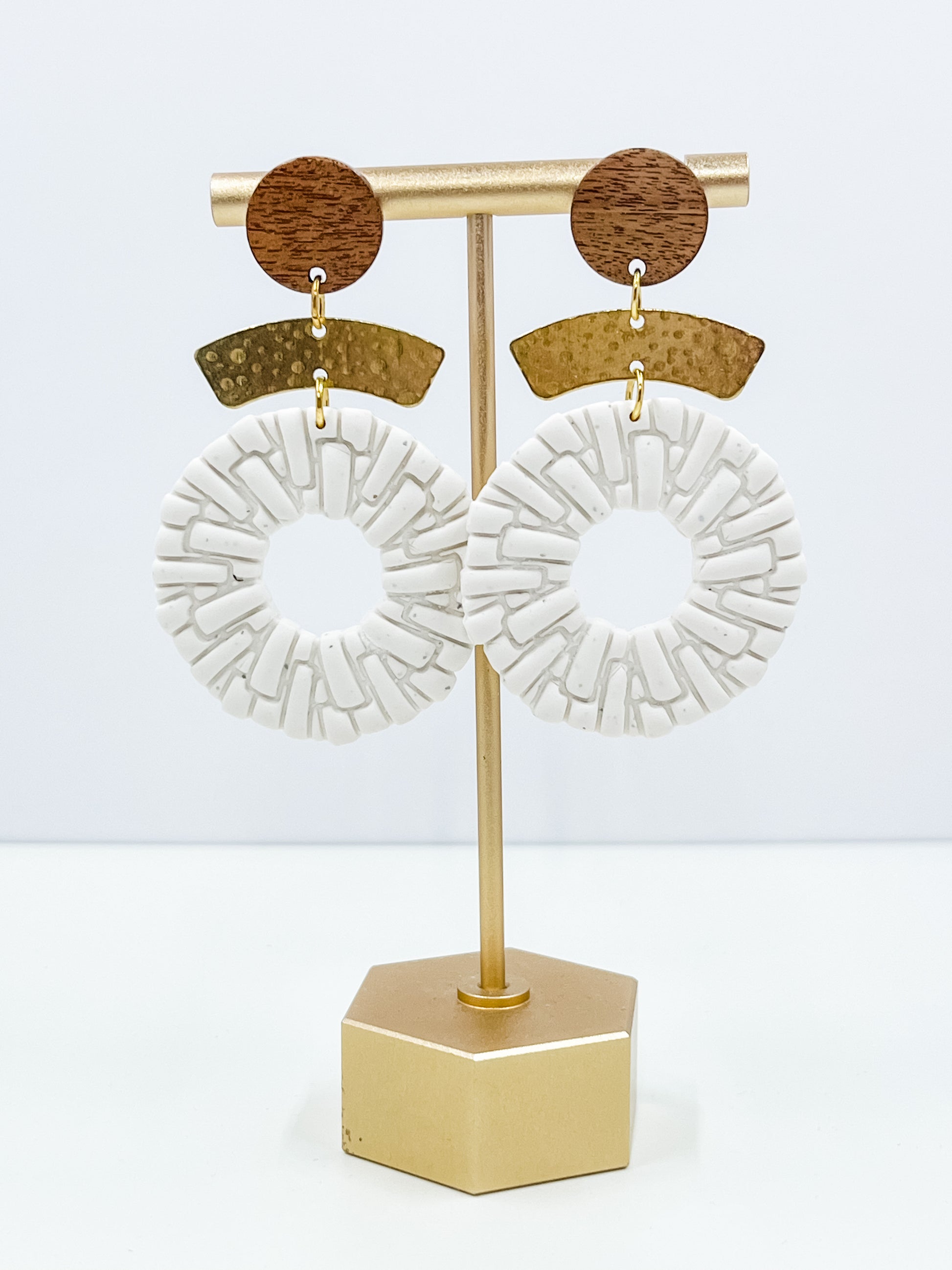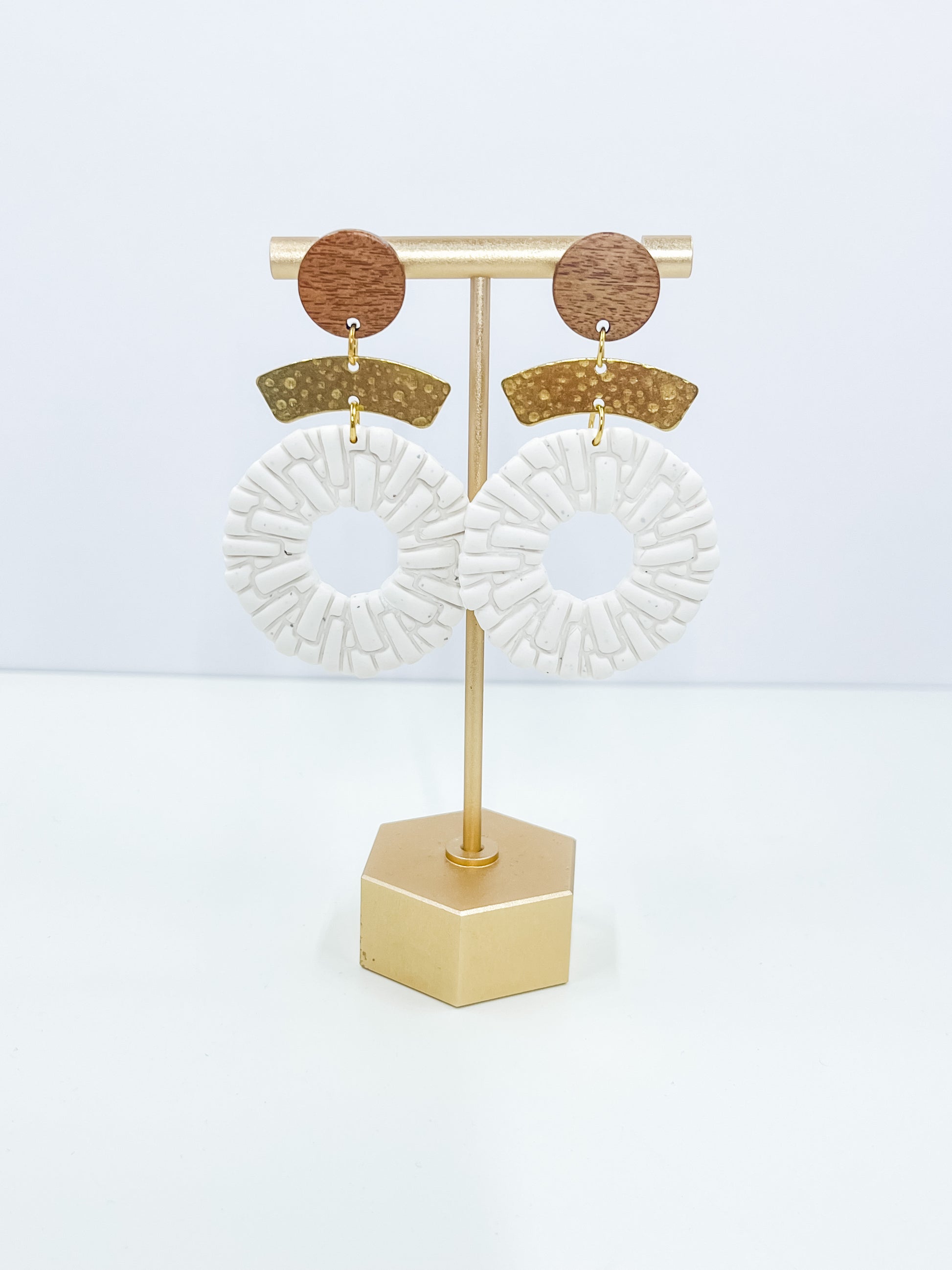 Speckled white circle earrings with a brass arch on a wooden topper with stainless steel post. Circle has faux rattan detail. Earring length is approximately 2.5 inches.