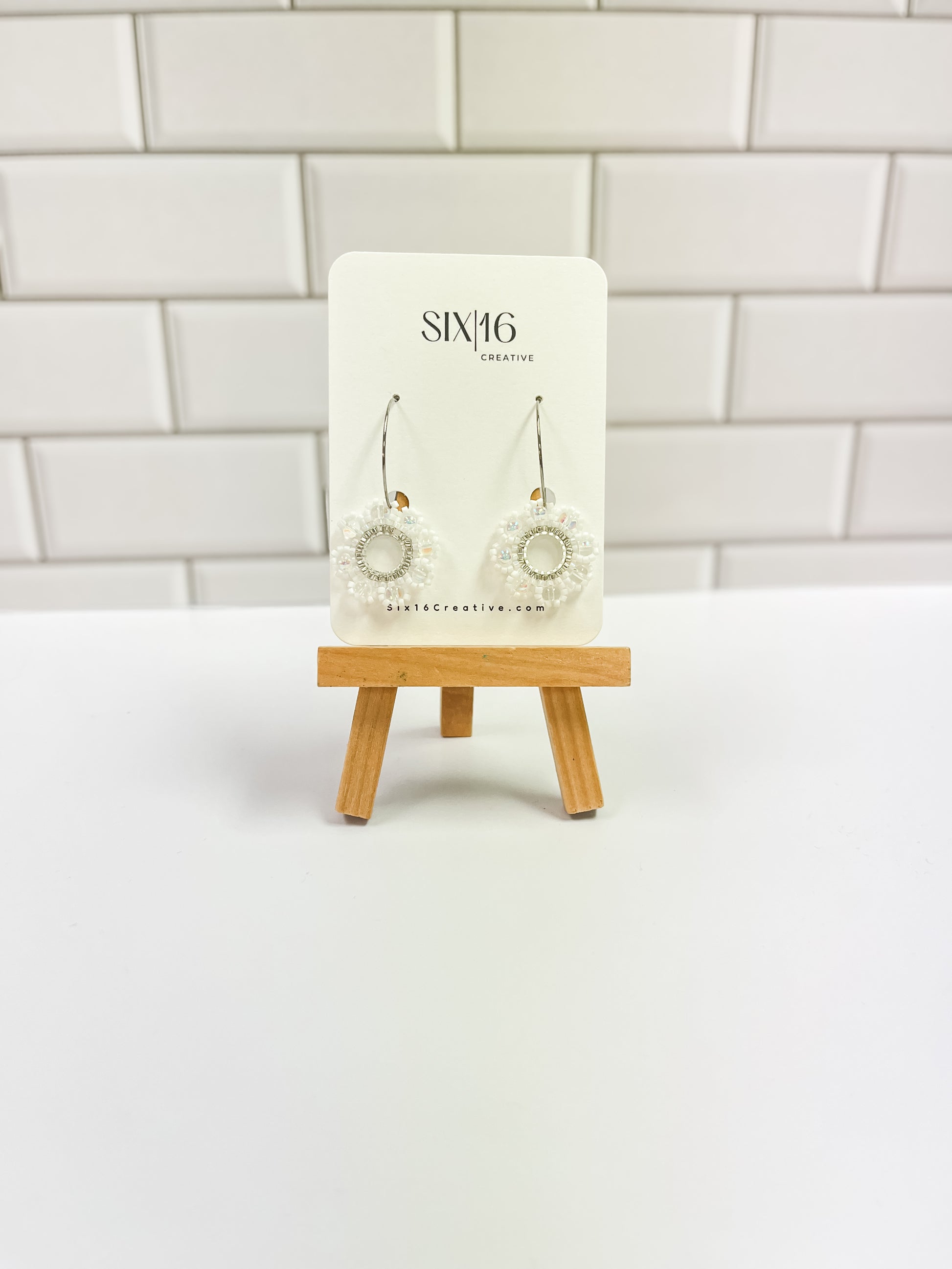 White flower beaded earrings on a stainless steel silver hoop. Earring length is approximately 2 inches.