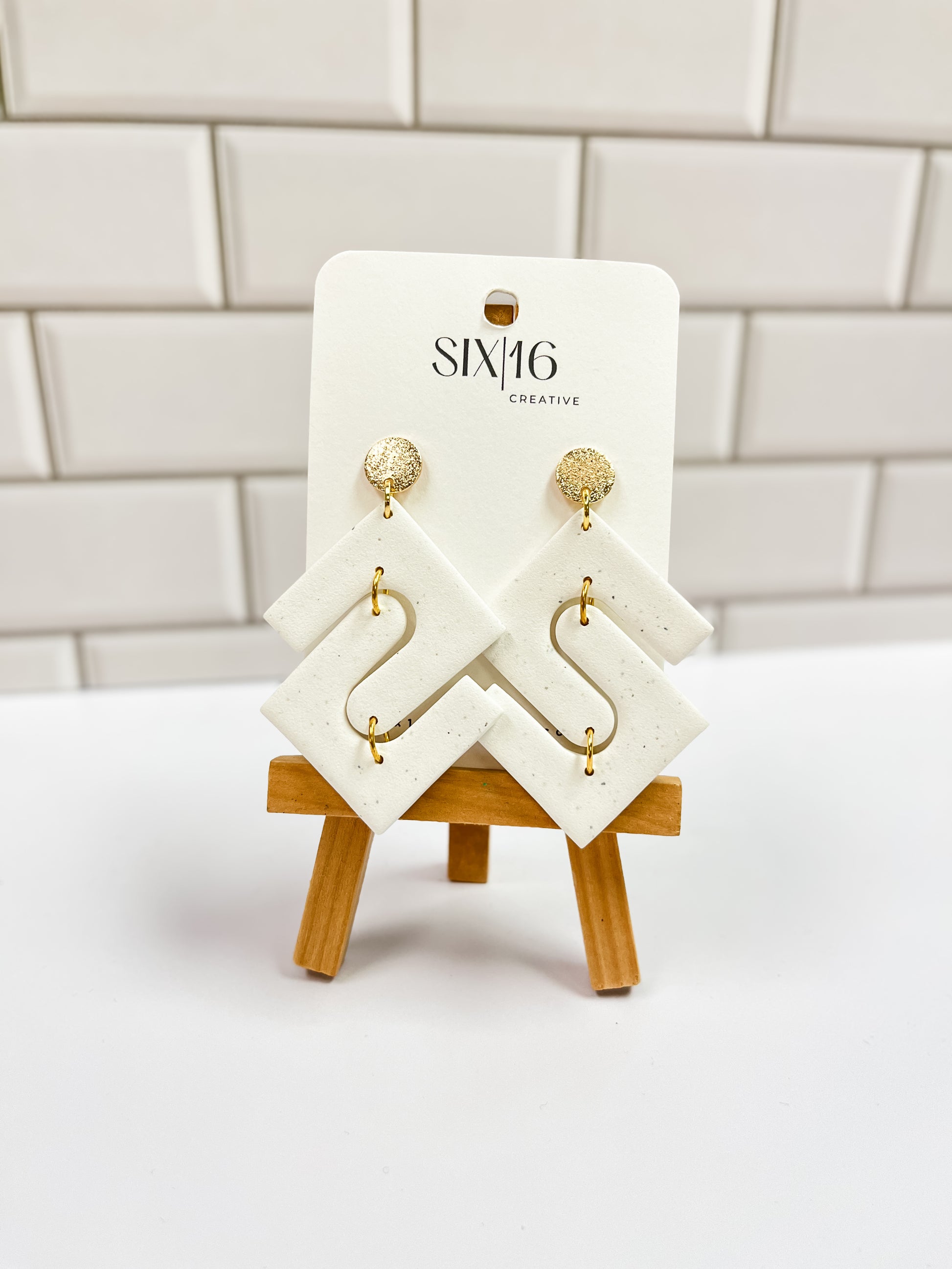 White geometric 2 piece clay earrings with a textured gold circle post. Earring length is approximately 2.5 inches.