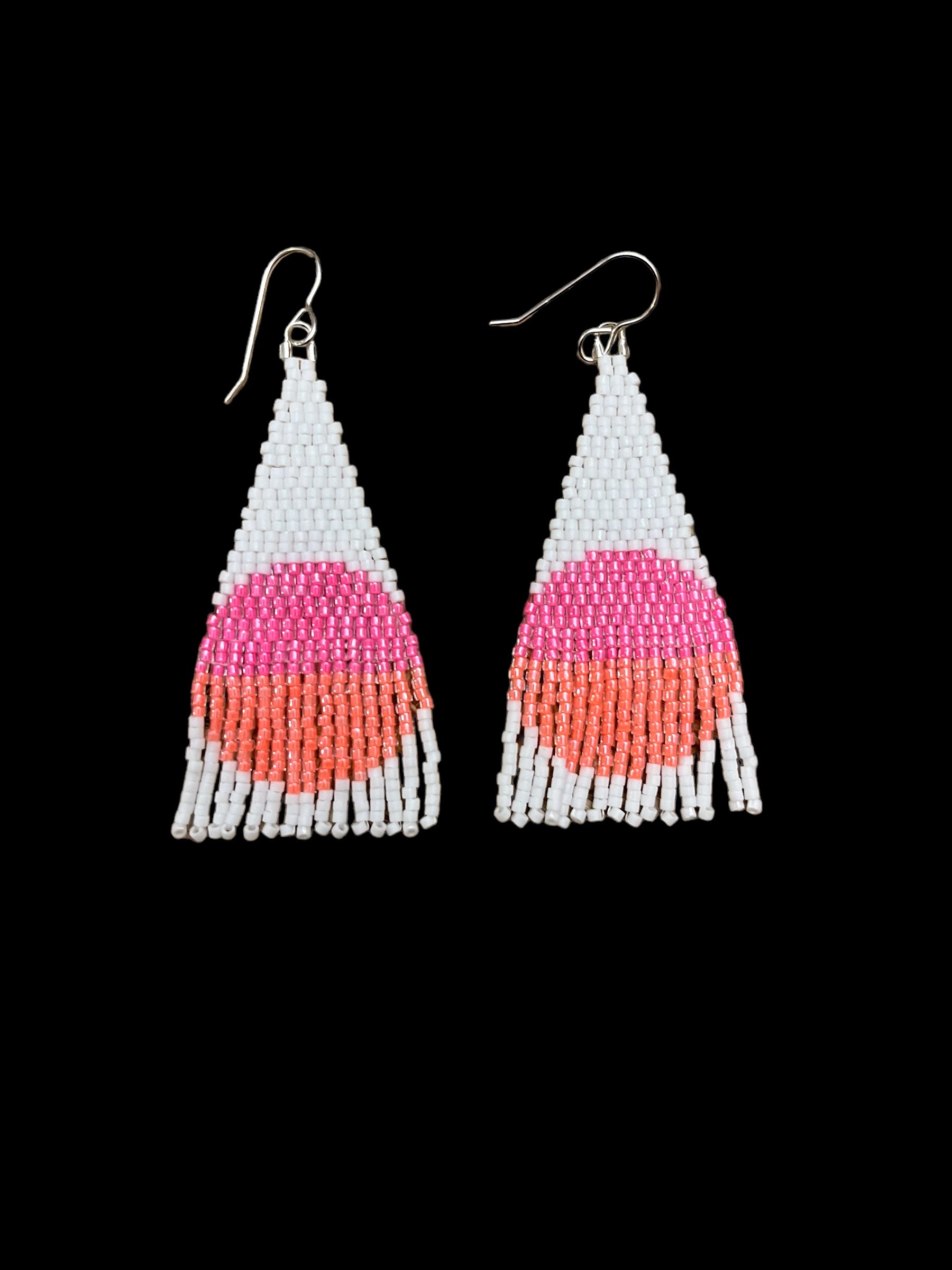 Handmade white, neon pink and neon orange beaded earrings with small fringe. The length is approximately 2.5 inches.
